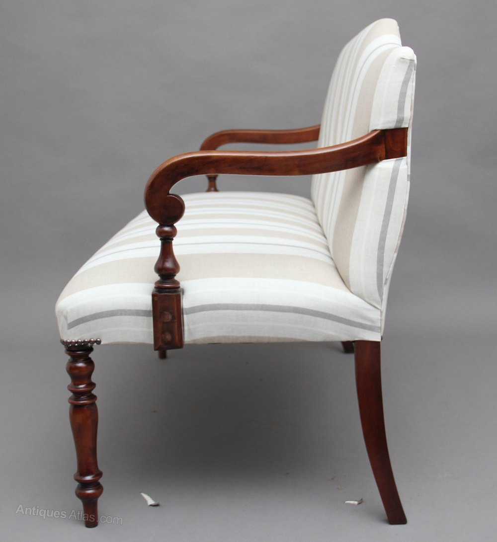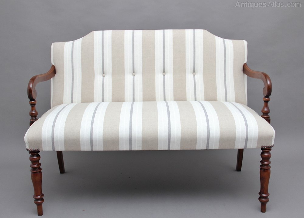 A mid 20th Century bench upholstered in a cream fabric with a stripped pattern, the bench having nice scroll arms, brass stud decoration, with nice turned period mahogany front legs and out swept legs to the rear. Circa 1960.