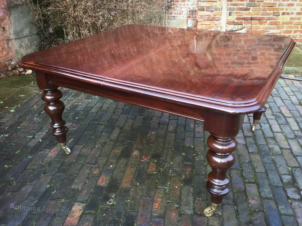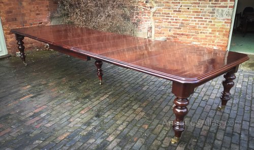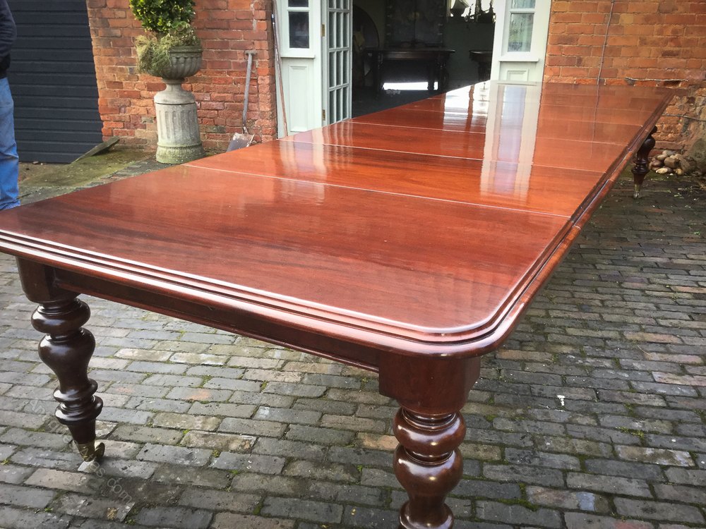 A Very Good Large Victorian Extending Dining Table in Mahogany with five original leaves, this is a wind out extending table with a mechanism working from both ends, it has an extra leg in the middle for added strength and support, it can be used with any combination of leaves , it is fully restored and French polished to a very high standard by ourselves, standing on substantial turned legs with brass castors, it will seat 16 or with 2 at the ends 18 diners
