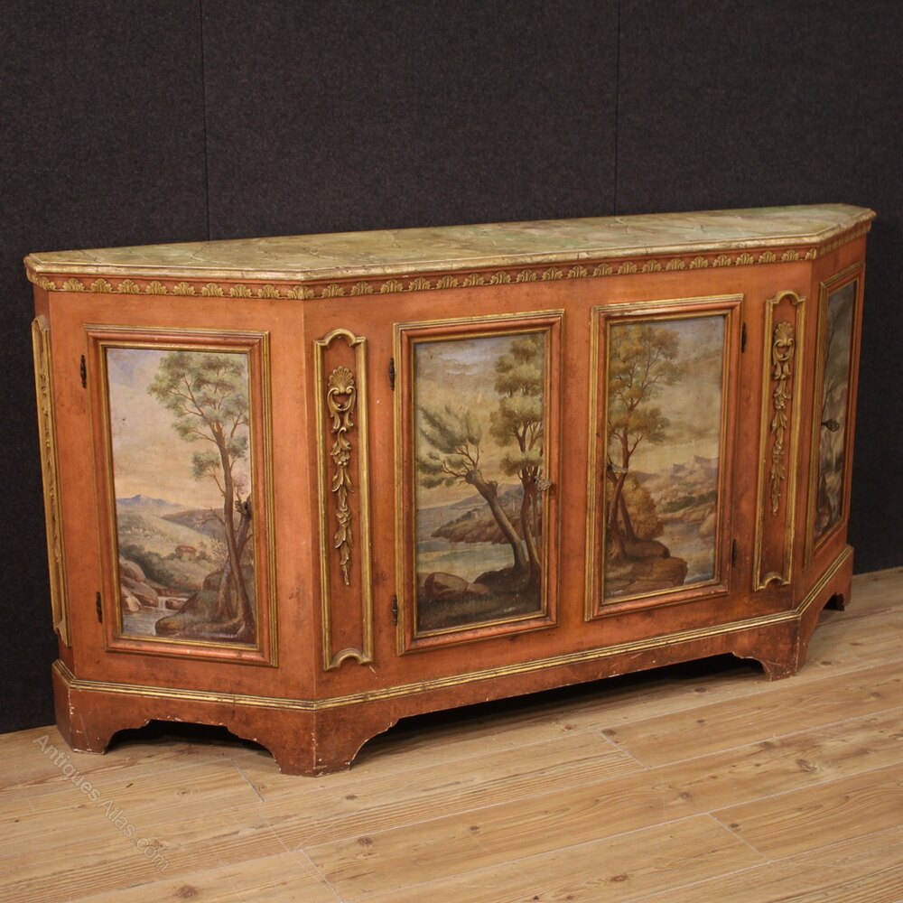 Venetian sideboard from the mid-20th century. High quality furniture in carved, lacquered and hand painted wood with eighteenth-century style landscapes. Sideboard with 4 doors, complete with 4 working keys, of excellent capacity and service. Very pleasant faux marble lacquered wooden top. Finely painted doors adorned with architectural views (see photo). Beautifully proportioned furniture, ideal for placing in a living room or sitting room, for antique dealers and interior decorators. Sideboard that offers inside a shelf and a base top, central doors with a single compartment. Furniture of great impact, in beautiful patina. Structurally sound and in good state of conservation.