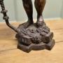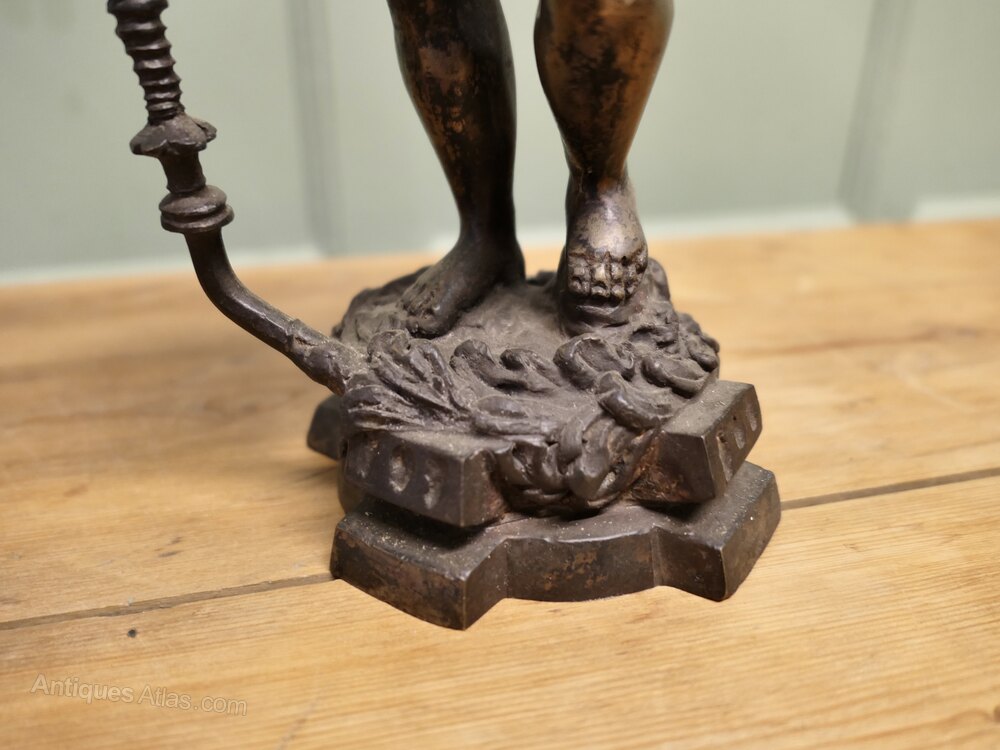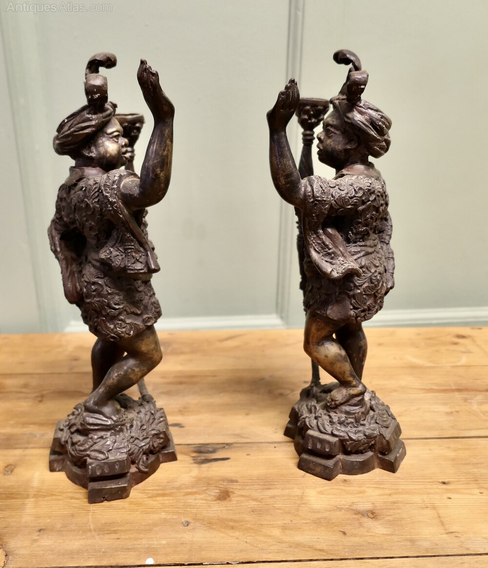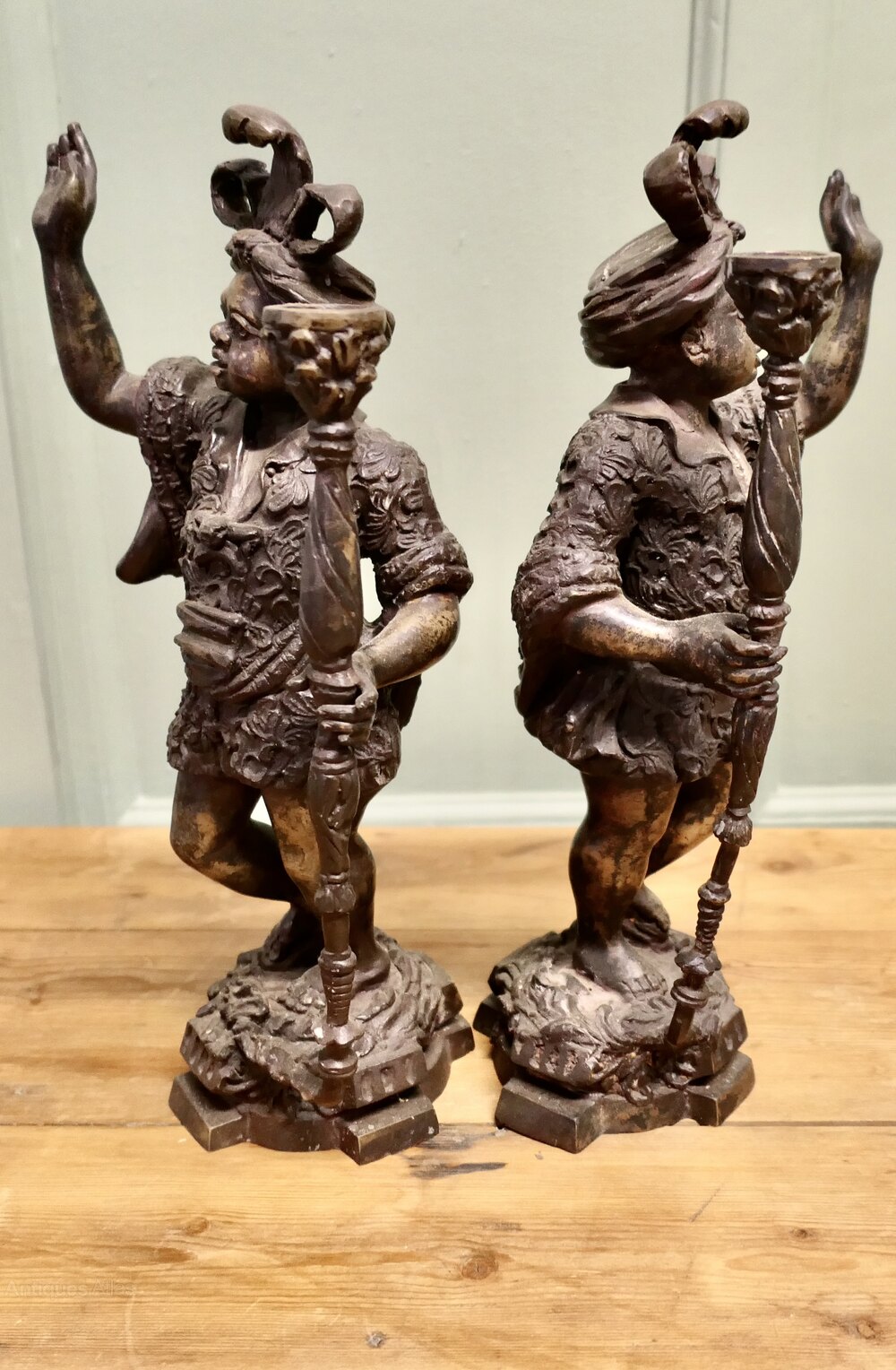 A very unusual and stunning pair of table top cast brass candlesticks, the candlesticks are warriors holding their arms up in greeting, they date from around the early 1900
