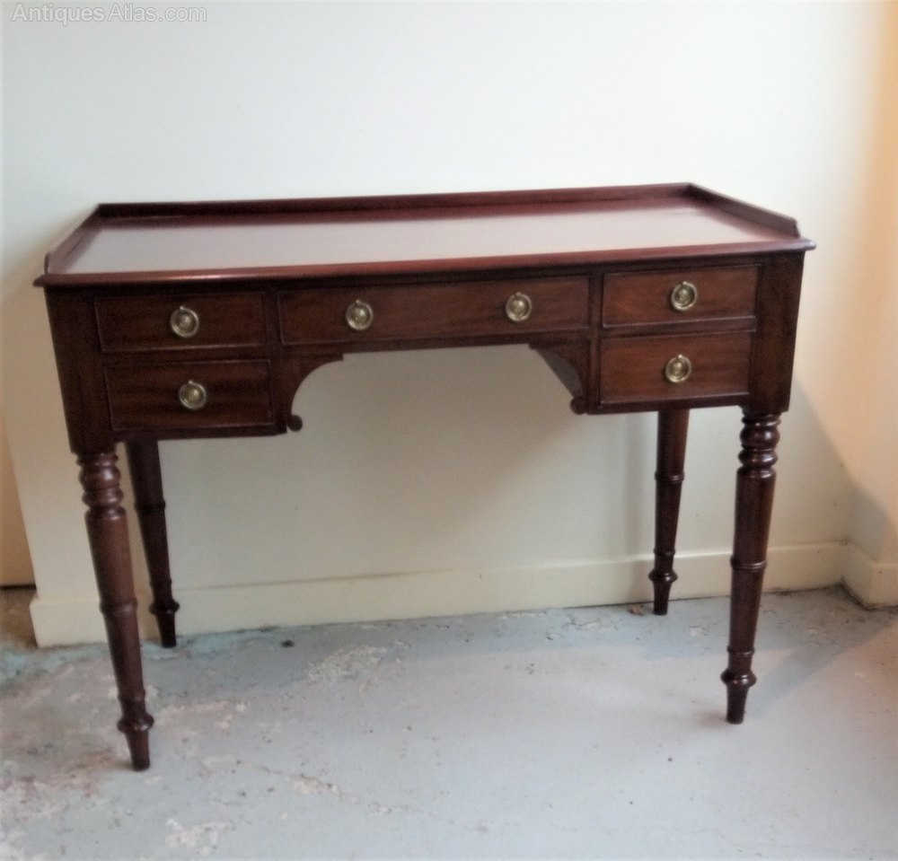 With so much versatility this pretty early 19th Century mahogany kneehole can be a desk or dressing table. It is in lovely clean condtion with good finish and colour and the 5 drawers sit on a nicely turned leg. A writing table perhaps that has a really good knee space at 66cms high.