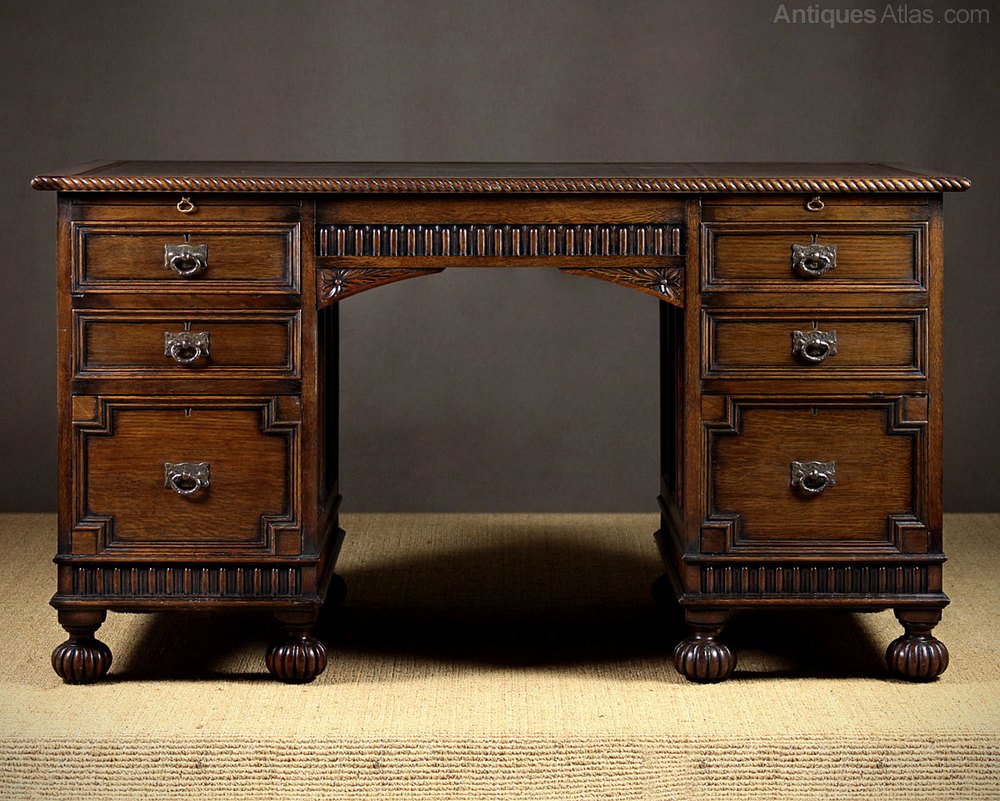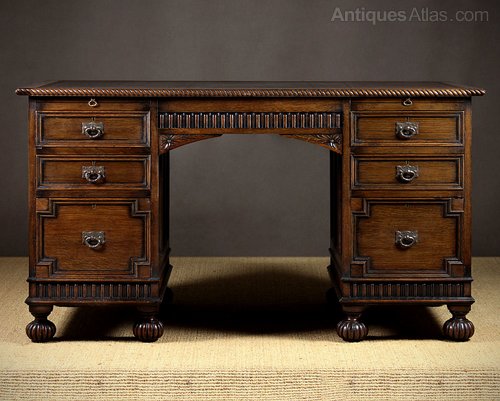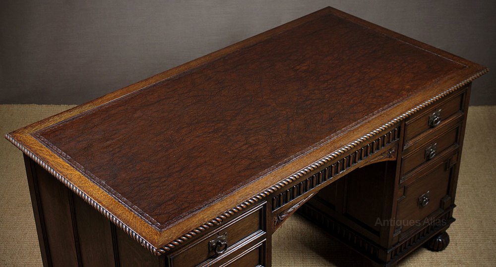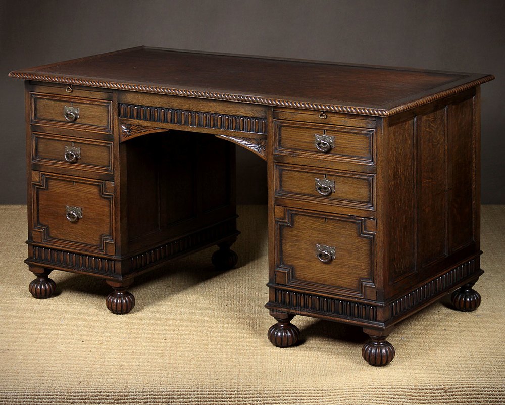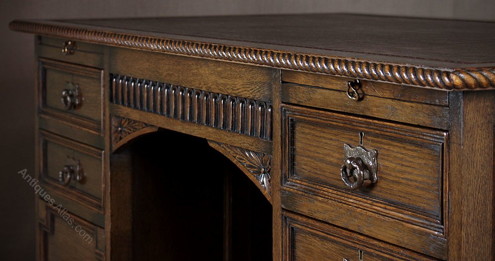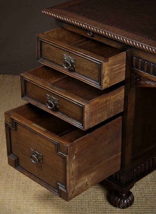 Very Good Looking Early 20thc Carved Oak Kneehole Desk