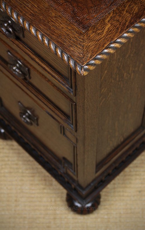 Very good looking early 20th.c. carved oak kneehole desk c.1920. 55″ x 28″ top with original faux leather writing surface and rope twist carved edge over two banks of three drawers with writing slides to each. Panelled oak sides, rear and drawer fronts. Crisp carved detail, unusual wrought steel handles and raised on reeded bun feet. Oak drawer linings. Excellent condition, cleaned and polished in our workshops.