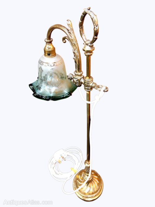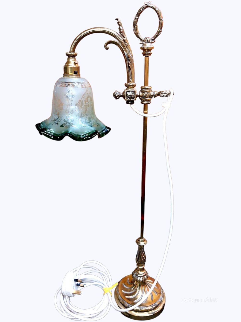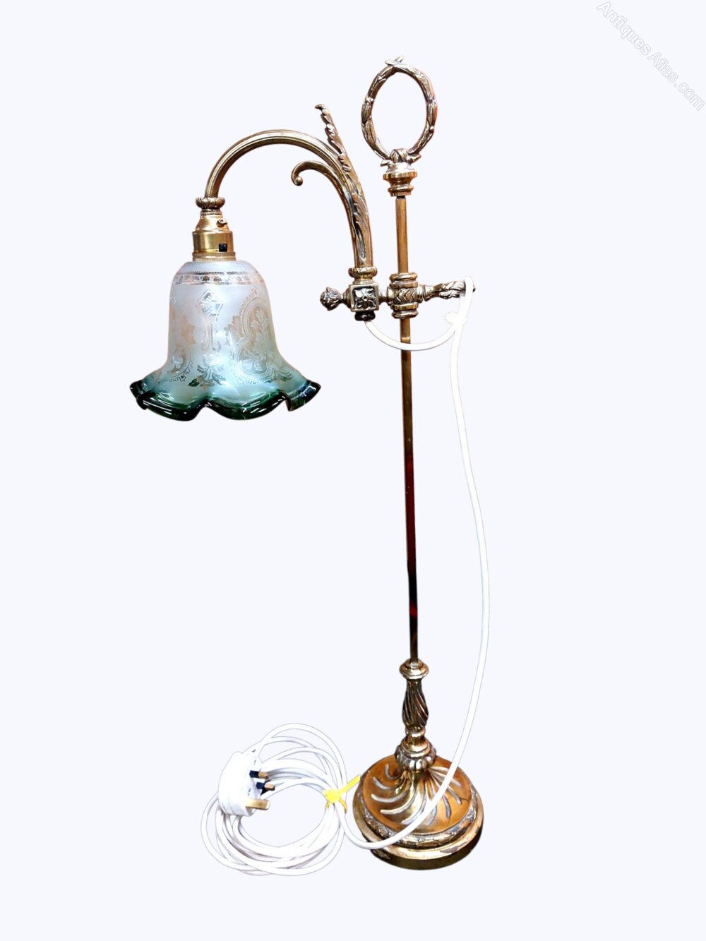 A very nice quality late Victorian brass reading lamp with sliding rise and fall action. Large in size at 25 1/2" tall. Nice original polish and has been rewired at some time with a white flex. I can have this changed if required to a traditional braided flex. Original etched shade with emerald green edging. Weighted base for stability. 25 1/2" tall x 10 1/2" wide x 5 1/2" deep. Superb condition and ready to use.