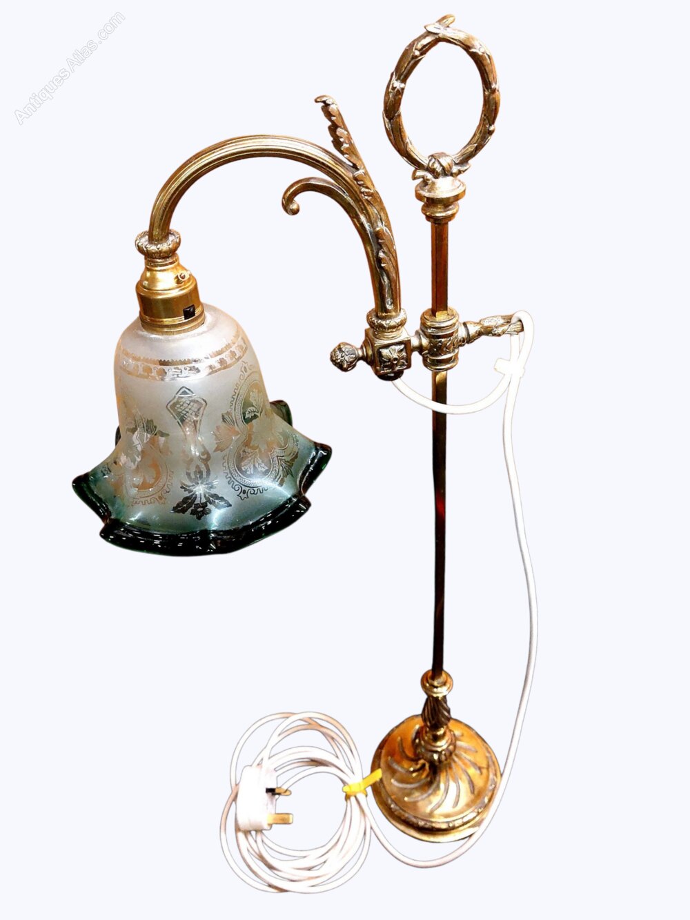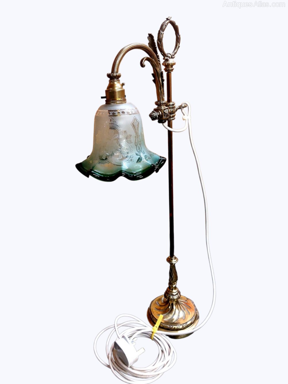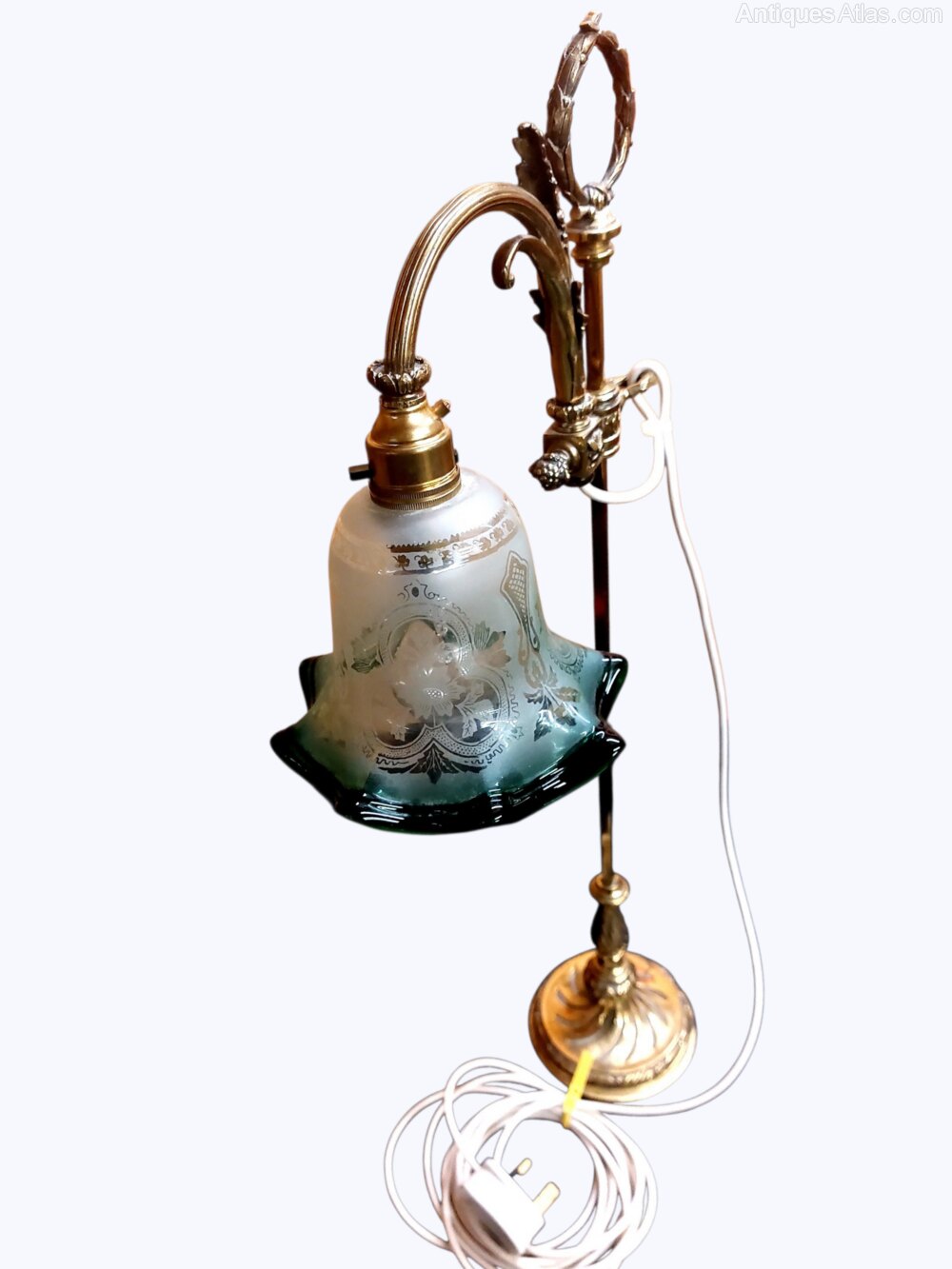 A very nice quality late Victorian brass reading lamp with sliding rise and fall action. Large in size at 25 1/2" tall. Nice original polish and has been rewired at some time with a white flex. I can have this changed if required to a traditional braided flex. Original etched shade with emerald green edging. Weighted base for stability. 25 1/2" tall x 10 1/2" wide x 5 1/2" deep. Superb condition and ready to use.