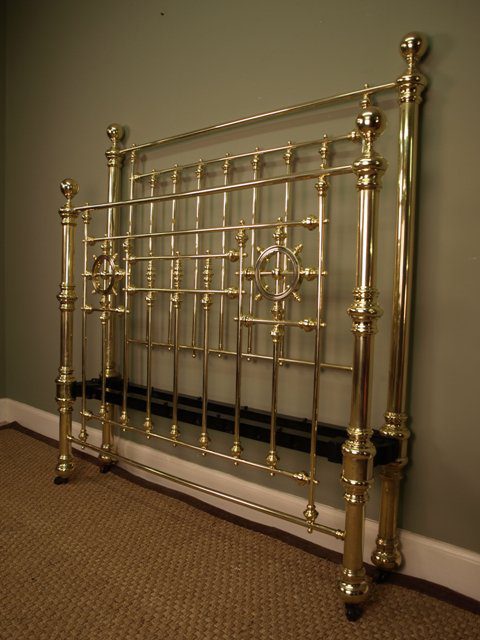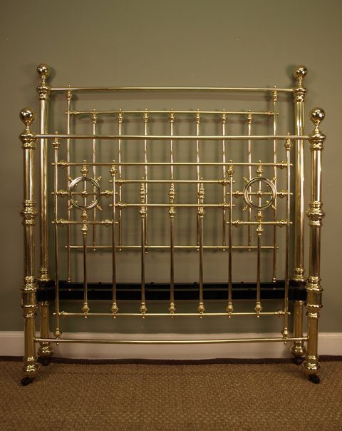 A beautiful Victorian Brass Bed with large end posts and knobs, retaining the original castors, spoke wheel decoration to the foot end. Lovely original condition throughout. This bed comes complete with a wooden slatted base and takes a standard modern double mattress.
