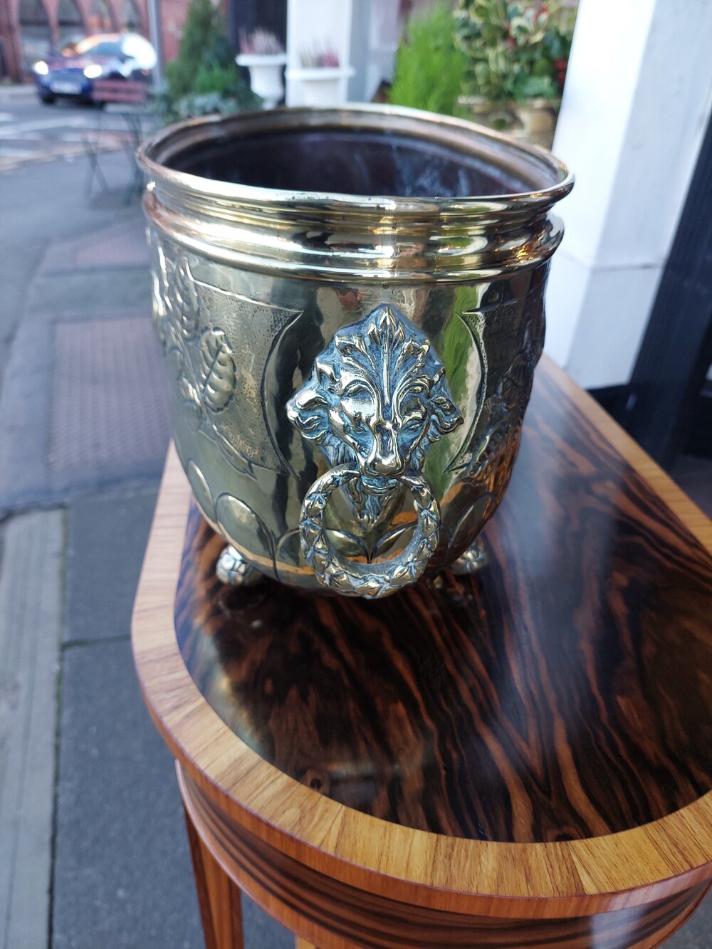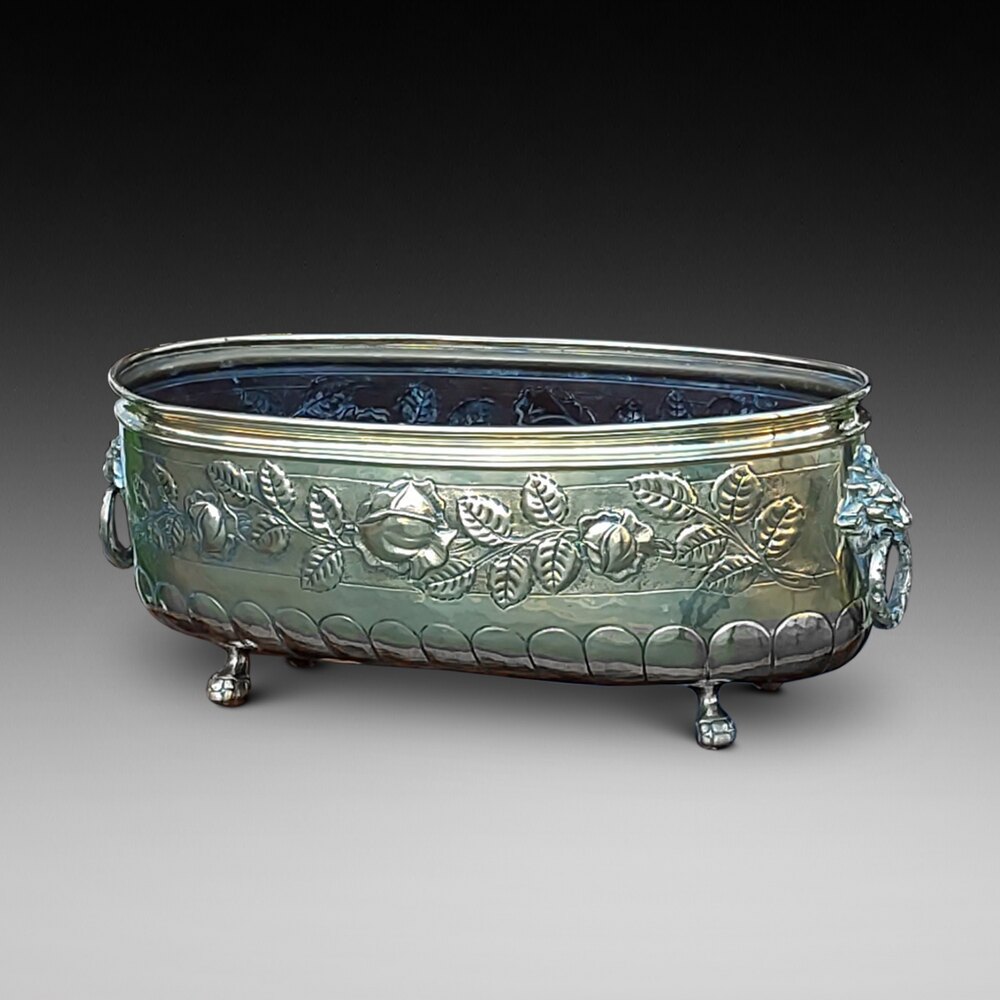 Victorian Brass Planter Trough with Pressed Foliate Border, Lion Mask Handles and Paw Feet - 21"w x 9"d x 9"h