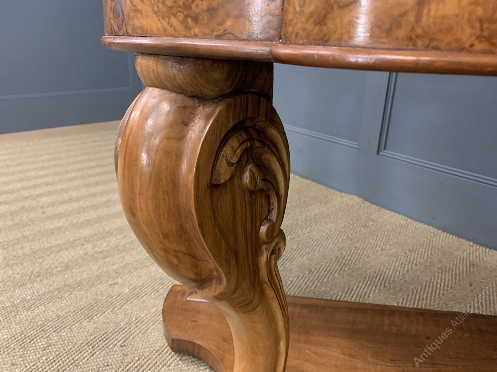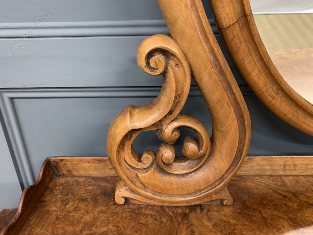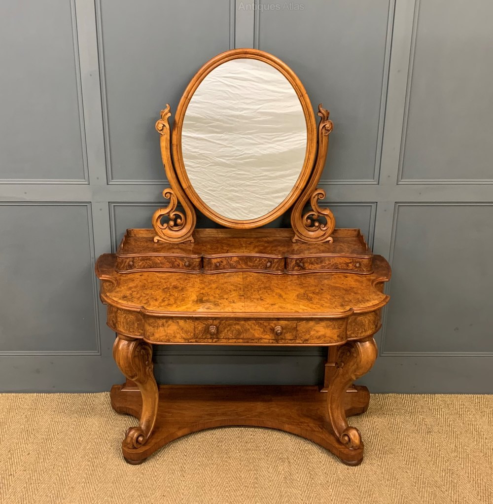 A splendid "Duchess" dressing table in burr walnut from the mid-Victorian period. Well made in solid walnut with attractive burr walnut veneers. The dressing mirror is supported by a pair of carved "antlers" and is fully adjustable, The superstructure has three antique jewellery drawers. The base section has a single central drawer to the freeze. It stands well on elegant scrolling cabriole legs which are embellished with carved detailing. This lovely dressing table is offered for sale in excellent condition, having been sympathetically refinished in our workshops. It has a rich colour and patina and is ready to go straight into the home.
