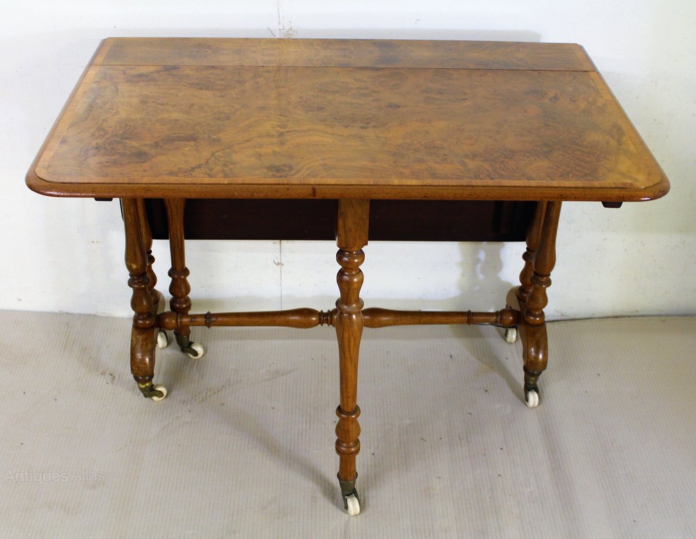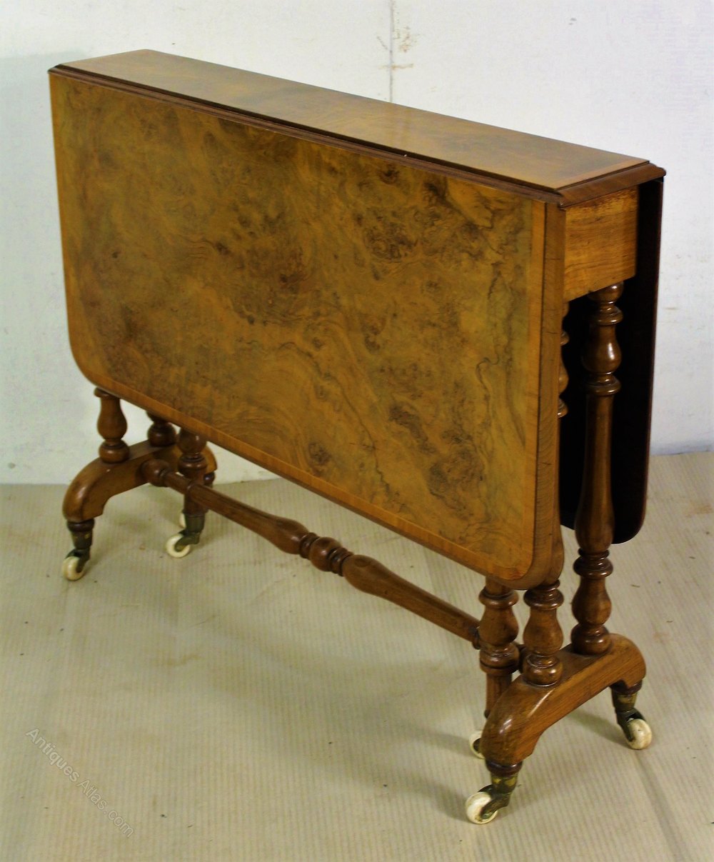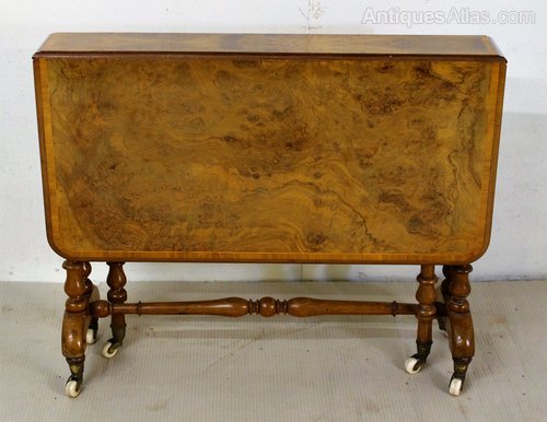 A lovely mid-Victorian period burr walnut Sutherland table. The top in burr walnut with rosewood cross banding and the legs and frame in solid walnut. With swing out legs to support the flaps when in the raised position. The legs terminate in their original brass and ceramic castors. With the flaps down this versatile table can be tucked neatly away. The top sympathetically repolished in our workshops and the whole table is offered for sale in excellent condition with a great colour and patina, ready to go straight into the home.
