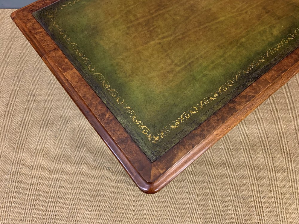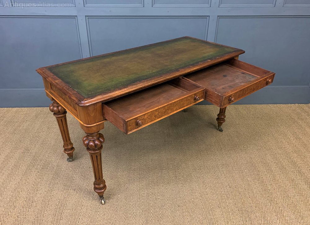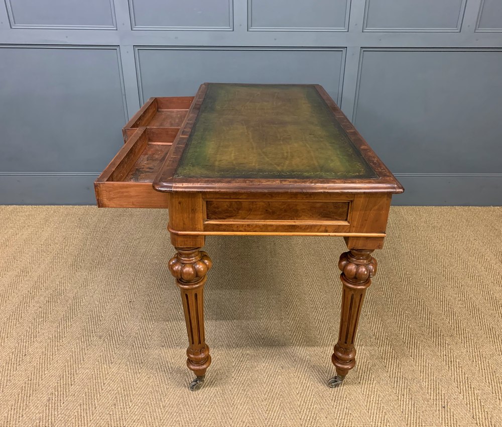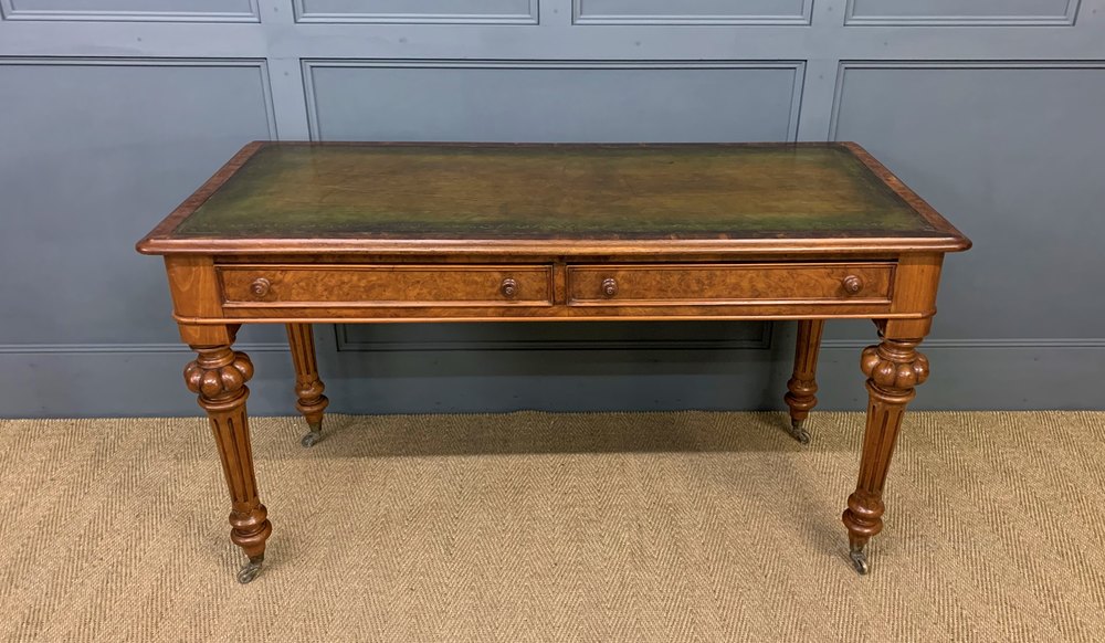 An excellent mid-Victorian period burr walnut writing table. Very well constructed in solid walnut with attractive burr walnut veneers. Of generous proportions and with a pair of drawers to the freeze. The top is inset with a sumptuous green leather writing surface complete with gilt tooled decorations to the surrounds. All standing on bold and elegant turned and reeded legs terminating in solid brass caps and castors. Sympathetically refinished in our workshops and now offered for sale in excellent condition, ready to go straight into the home or office.