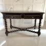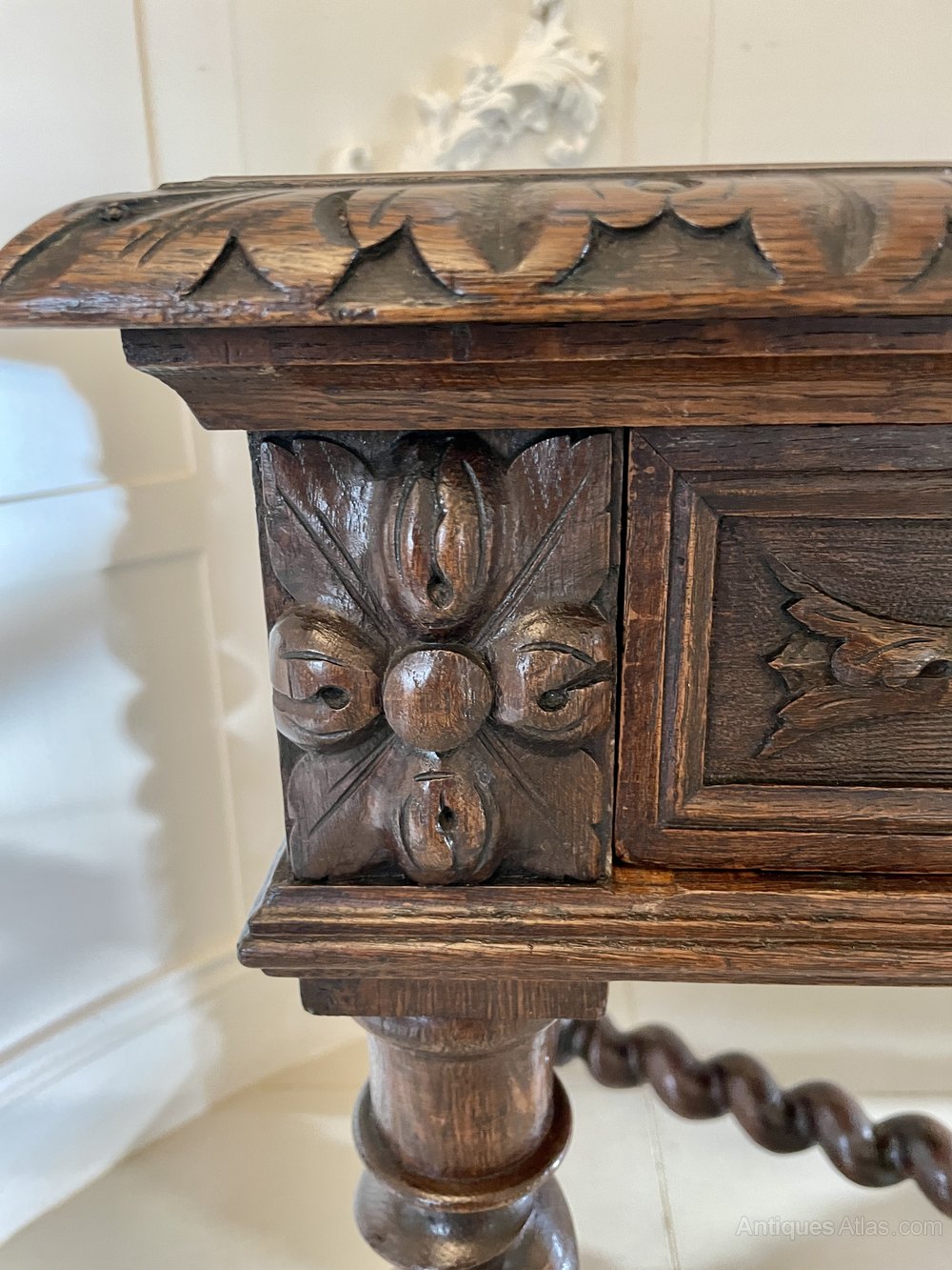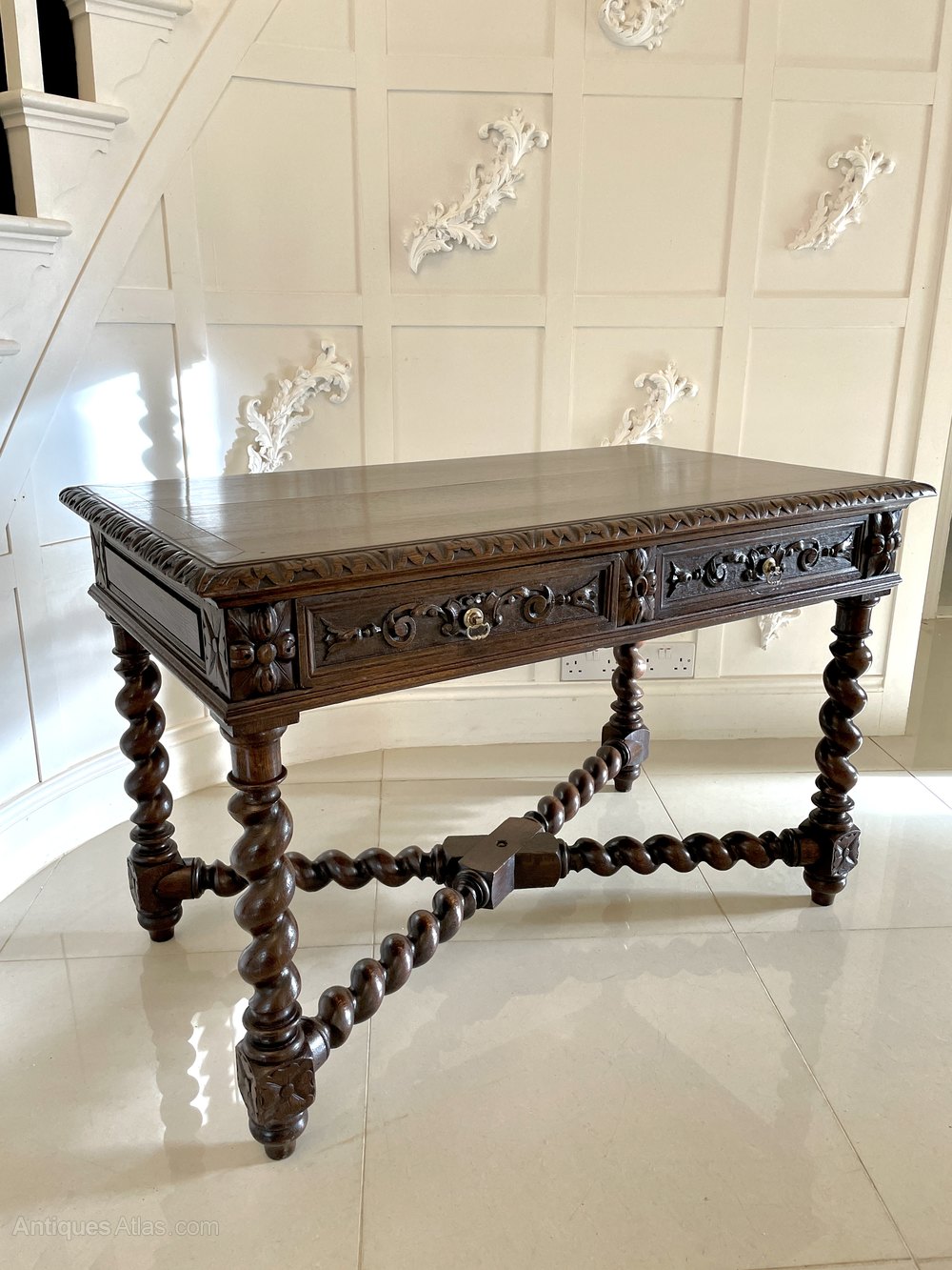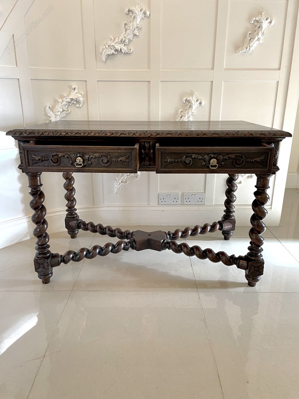 Antique Victorian quality carved oak freestanding centre table having a quality oak top with a quality carved edge, two carved oak drawers with original brass handles and a freestanding polished panelled back and sides. It stands on quality oak barley twist legs with carved blocks raised on turned feet and united by a oak barley twist cross shaped stretcher.