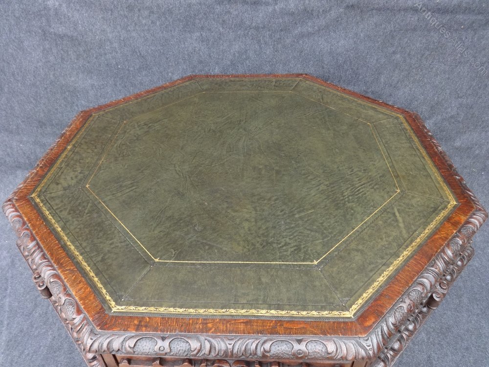 Octagonal table with green leather inset, 4 opening drawers, standing on central pedestal with green man carvings, in excellent original condition.