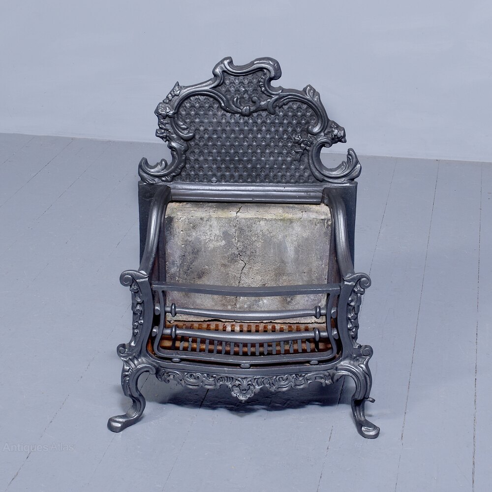 Circa 1818. Victorian cast iron Rococo-style fire basket. The shaped back with Rococo C scrolls and punched decoration. The curved sides of the fire basket and a convex front with ring turned bars flanked by Rococo decoration. The base with an open rococo skirt and all supported on cabriole feet. In excellent condition.