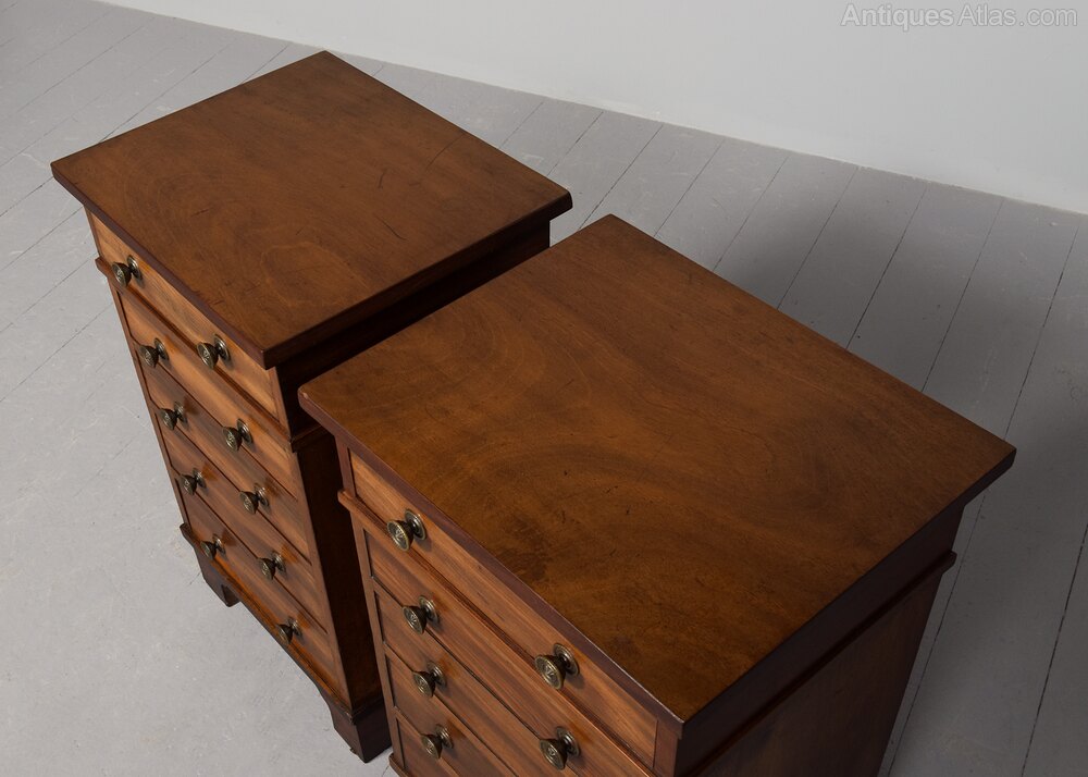 Circa 1840 with adaptations. Pair of neat-sized early Victorian chest of drawers/bedside lockers. The rectangular tops in a mellow mahogany over five drawers with embossed brass handles. All supported on shaped bracket feet.