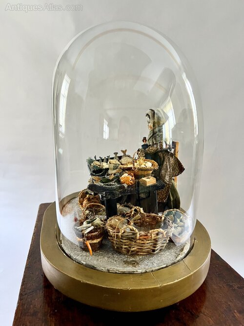 Impressive example of the late 19th century Pedlar Doll. Under the glass dome, set into an oval gold painted stand, is a Fish Seller with her wares. Dressed against the cold and holding an umbrella, she has a vibrant painted face. Her extensive sea food is laid out in trays and baskets some are made up of tiny shells. A lovely piece of folk art, beautifully presented, standing on gold bun feet, and in very good condition. Circa 1880
