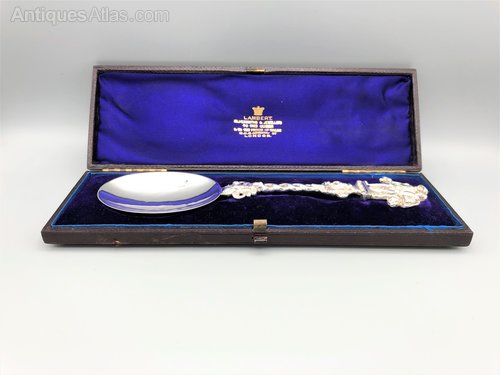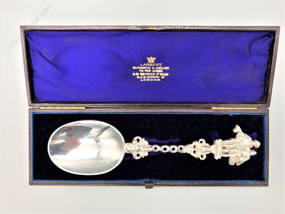 The spoon is presented in a Victorian silk and velvet lined box from retailers Lambert of Coventry Street, London, "Silversmiths & Jewellers to The Queen (Victoria) & to The Prince Of Wales (the future Edward VII)"