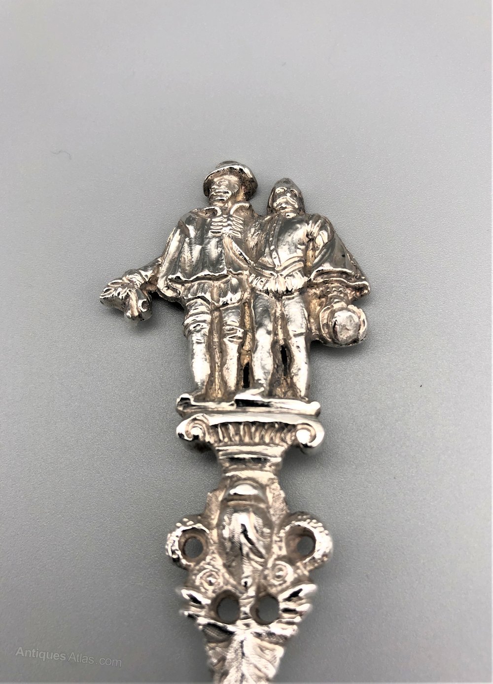 The shape of the spoon bowl is a replica of a Tudor style spoon. The stem is very ornate with a figure of a cherub, or possibly a mermaid, just above the bowl. The main stem is then an open barley twist surmounted by two dolphins with two Tudor figures standing on an Ionic capital. One of these is definitely Sir Francis Drake but I'm not sure who the other one is, presumably one of Drake's fellow officers on board the Golden Hind.