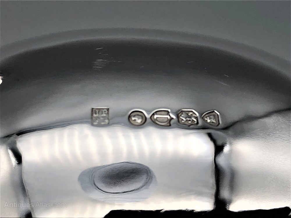 The hallmarks on the underside of the bowl are well struck and clear to read. They show the lion passant for Sterling Silver, the leopard's head assay mark for London, the date letter "D" for 1879, the Queen Victoria duty mark and the JP over FP makers' mark for the Pairpoint Brothers.