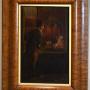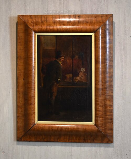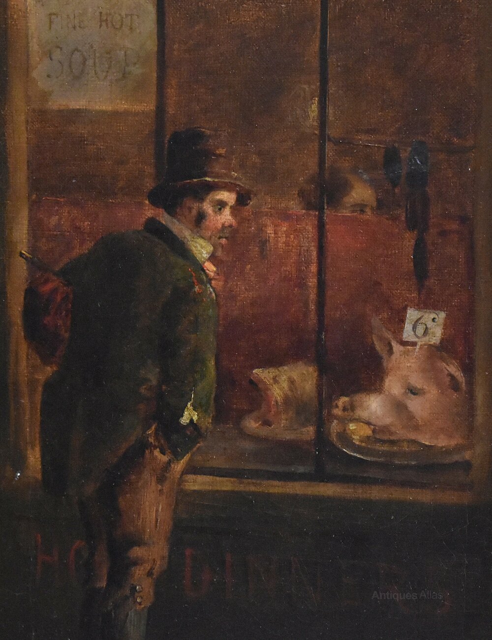 A charming oil on canvas depicting a traveller longingly looking in a restaurant window. The work is beautifully observed with a great deal of humour coupled with technical skill. The painting shows a traveller with his belongings bundled and tied to a stick under his arm. He has stopped to look in a restaurant window and stares longingly at the roast pig’s head, and rack of beef, probably lacking the funds to buy anything. The restaurant owner can be seen peeking over the window dressing, hoping the man won’t come in. The whole work is very competently done for this type of Victorian humourist painting, there is some great detail, particularly in the signage of the restaurant. The work is in good condition there has been an old repair to the canvas around the string of sausages hanging in the window. The painting is not signed or dated, which is not unusual for this type of work, but the Rowney canvas used would date it to the 1860’s. The painting is framed in a period maple frame but it is not the original, it does work extremely well with the tone of the work. The whole has a great period look, and is full of charm and humour.