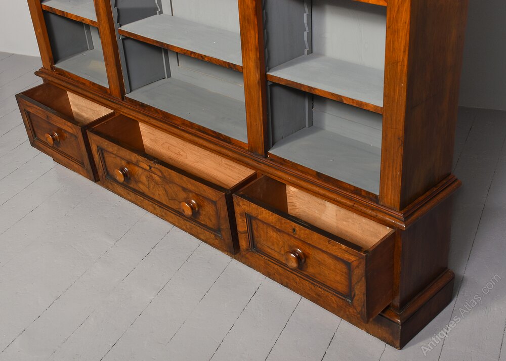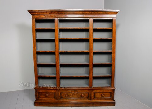 Circa 1860 with adaptations. Mid Victorian figured-walnut tall, three-section open bookcase. Surmounted by a classical moulded (“cushion”) Victorian cornice above a beaded frieze in figured walnut. The three bookcase sections, each has five adjustable shelves with walnut facings and are flanked and separated by figured walnut columns. The base with a moulded fore-edge, with three drawers with panelled walnut fronts and original turned wooden knobs. All sitting on a moulded and enclosed plinth base. In excellent condition with a mellow golden colour.