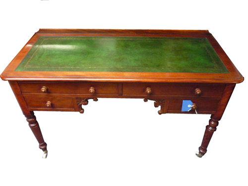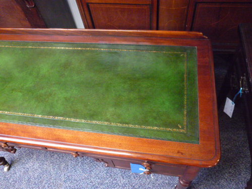 Selling is a very nice Victorian Four Drawer Mahogany Writing Table. The top of the writing table has been re-leathered in Antique Green with gold tooling. Below the top it has two long drawers and two short. The writing table stands on elegant turned legs. The table is in a very nice condition having been re-polished by hand. And has all of its original handles.