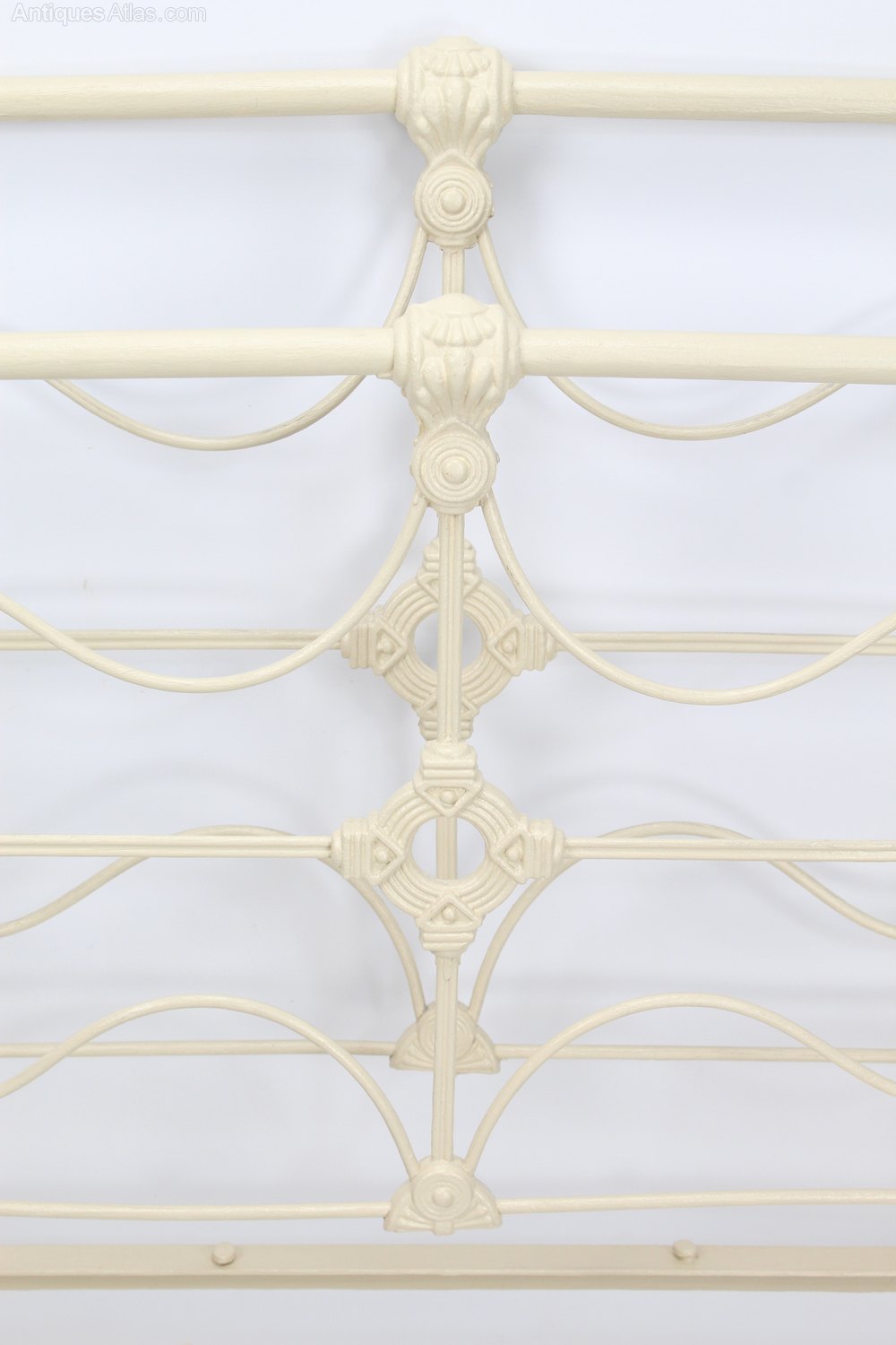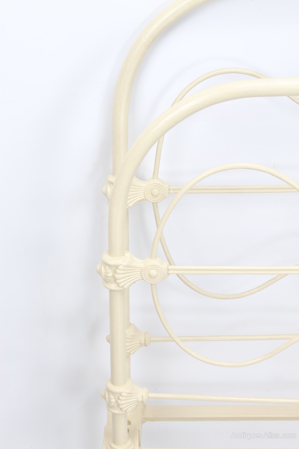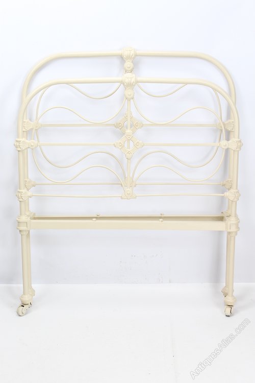 A lovely antique Victorian all iron single bed in a painted cream finish and dating from circa 1880. It has a pleasing shape, with a curved iron frame with wavy inner rails around a central cross with a decorative central casting all joined by ornate castings. It stands on ceramic casters. Comprising a headboard, footboard and drop-in side irons with jigsaw fittings. No base or mattress included.