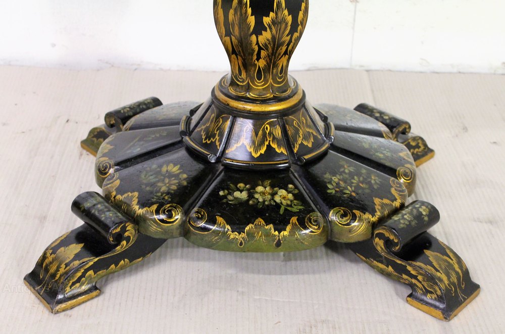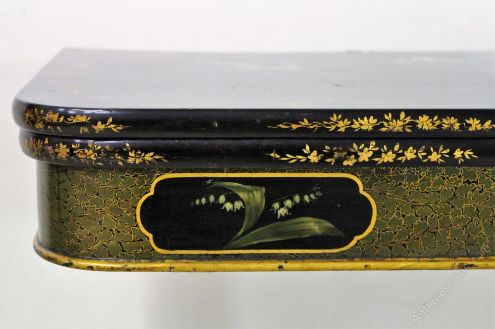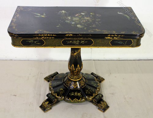 A superb and rare Victorian period Japanned lacquered card table. Of fine construction with lacquer applied onto a mahogany and papier mache frame. Decorated with painted scenes of flowers, birds and butterflies and with gilt work detailing. The playing surface is fitted with a green baize which is in perfect order. This wonderful table is offered for sale in excellent original condition, ready to go straight into the home. It is an extraordinary piece of high quality Victorian decorative antique furniture.