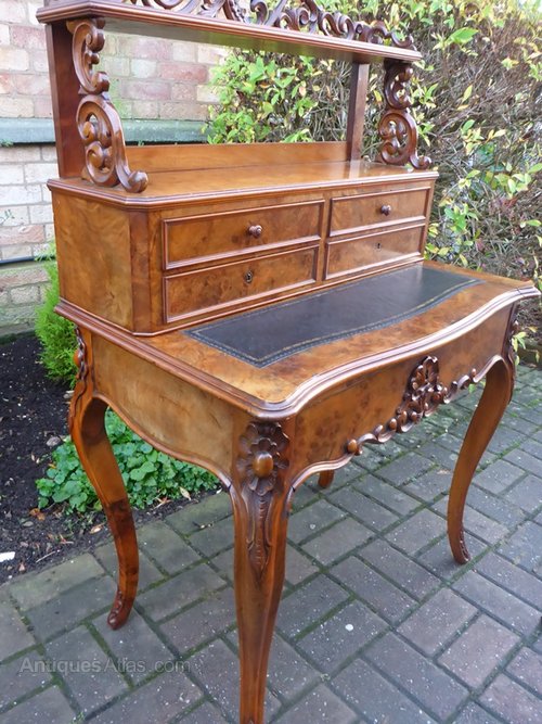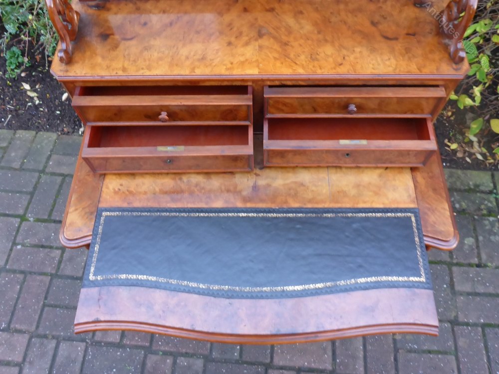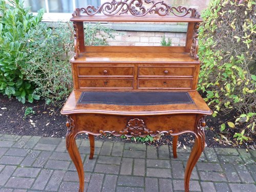 A Very pretty Lady Desk in Burr Walnut, standing on carved cabriole legs with a single large drawer, the desk top slides forward to use and has a black leather skiver, there are 4 small drawers 2 are locking, nicely carved pediment and supports.
