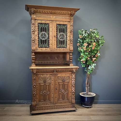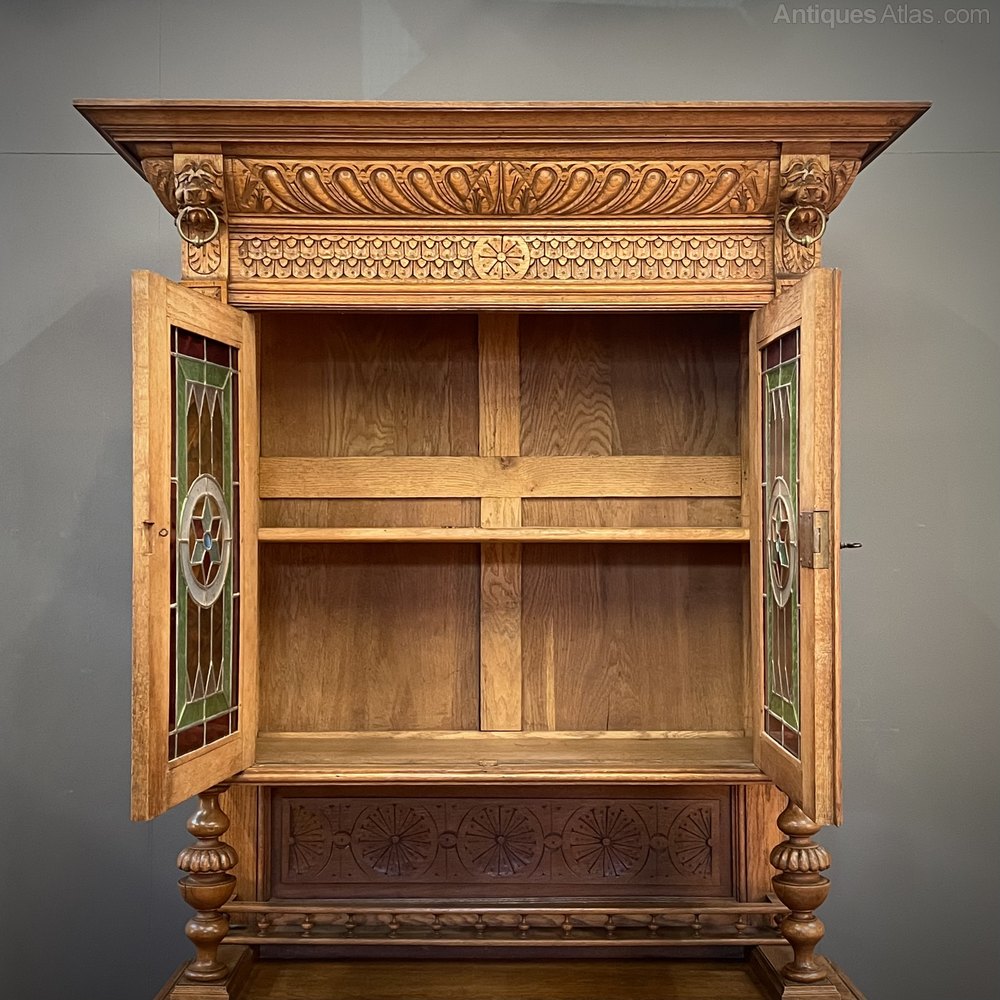 The top section features a raised two door cabinet. The doors each have lovely leaded coloured glass panels of red and green. The right hand door is fitted with a lock (key is supplied), the left hand door has a mid height catch. Internally there is a mid-height wooden shelf. Below the doors there is a carved panelled back with a small raised gallery. The top has a well turned column at the front, at each side for support.