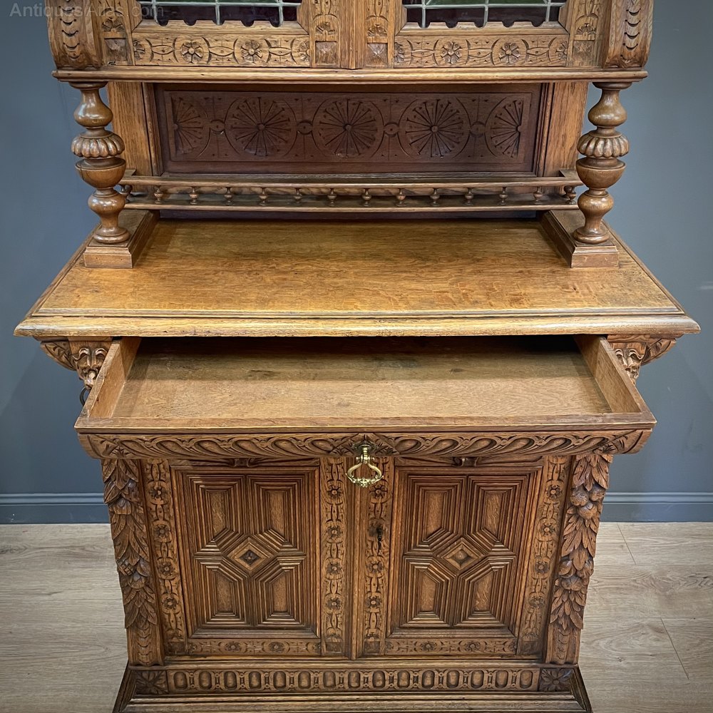 The base section consists of a full width recessed drawer over a two door cupboard with two side hinged panelled doors. The drawer has a lovely curved shape with deep carvings and is fitted with an attractive drop handle. The doors each have attractive heavily carved panels. The right hand door is fitted with a lock (key is supplied), the left hand door has a catch from the shelf. Internally there is a single wooden shelf.