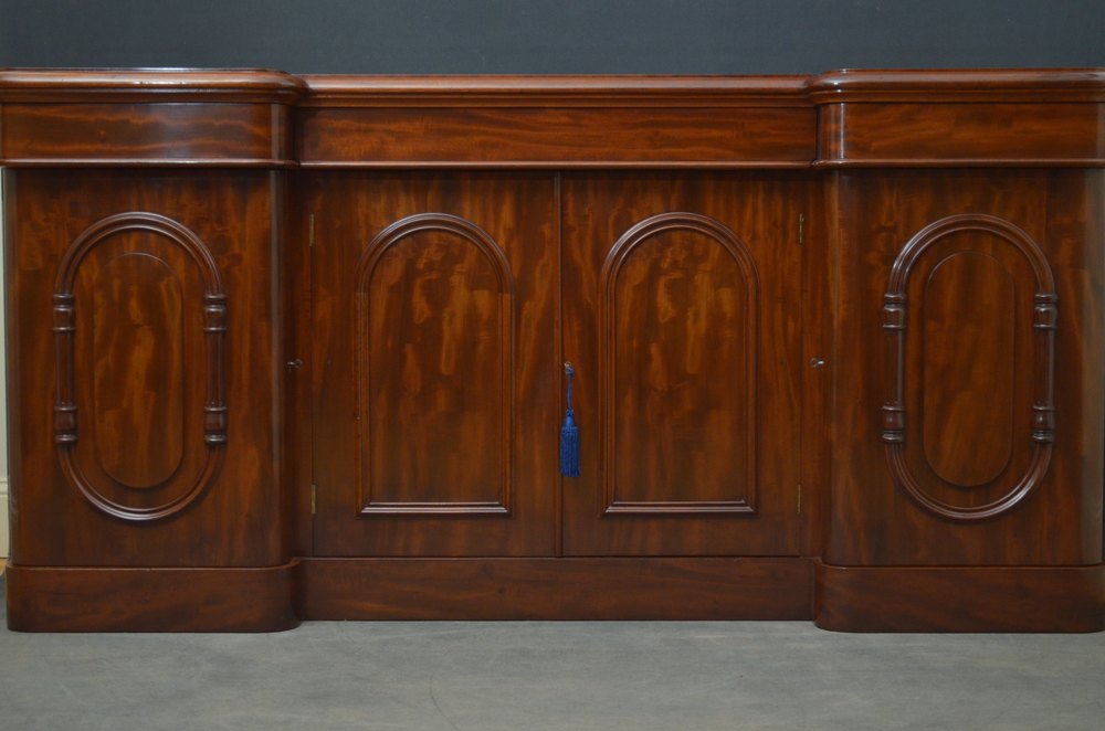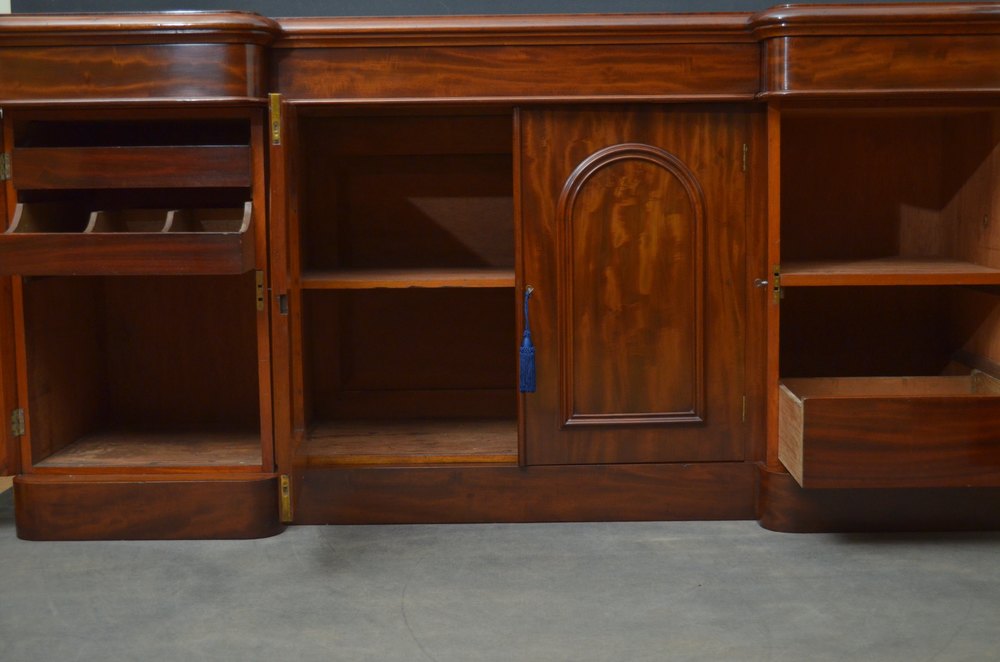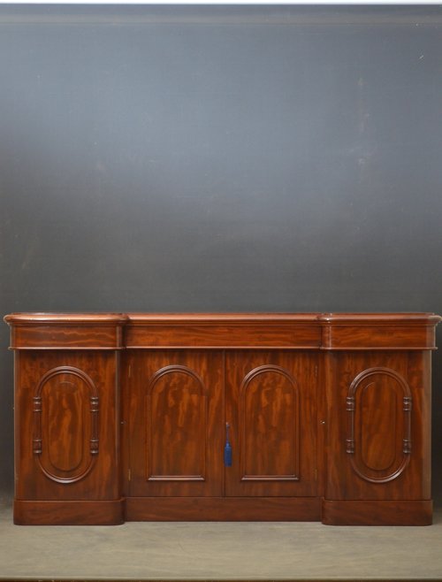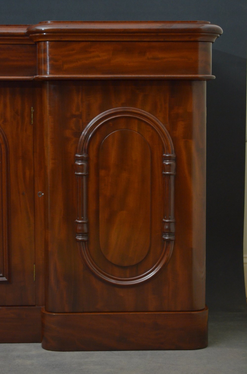 Sn4570 Victorian 4 door, breakfronted sideboard in mahogany, having figured top with moulded edge above 3 oak lined, frieze drawers and a panelled cupboard doors enclosing a shelf and flanked by further arched and panelled cupboard doors enclosing sliders and a shelf with a slider,all fitted with original working locks and 3 keys, all standing on plinth base. This antique sideboard has been sympathetically restored and is ready to place at home. c1870