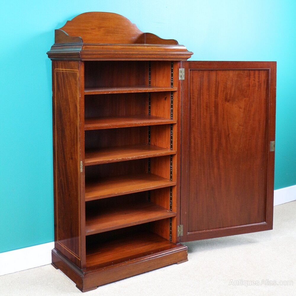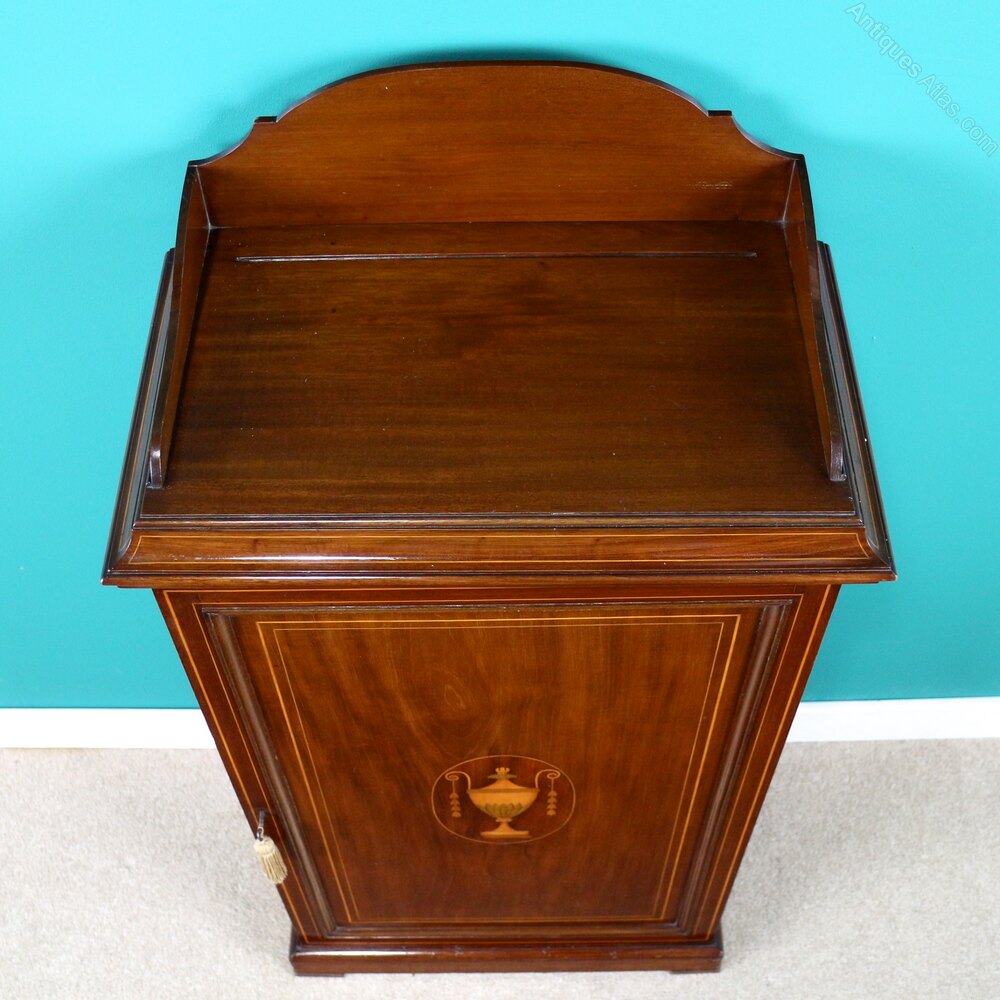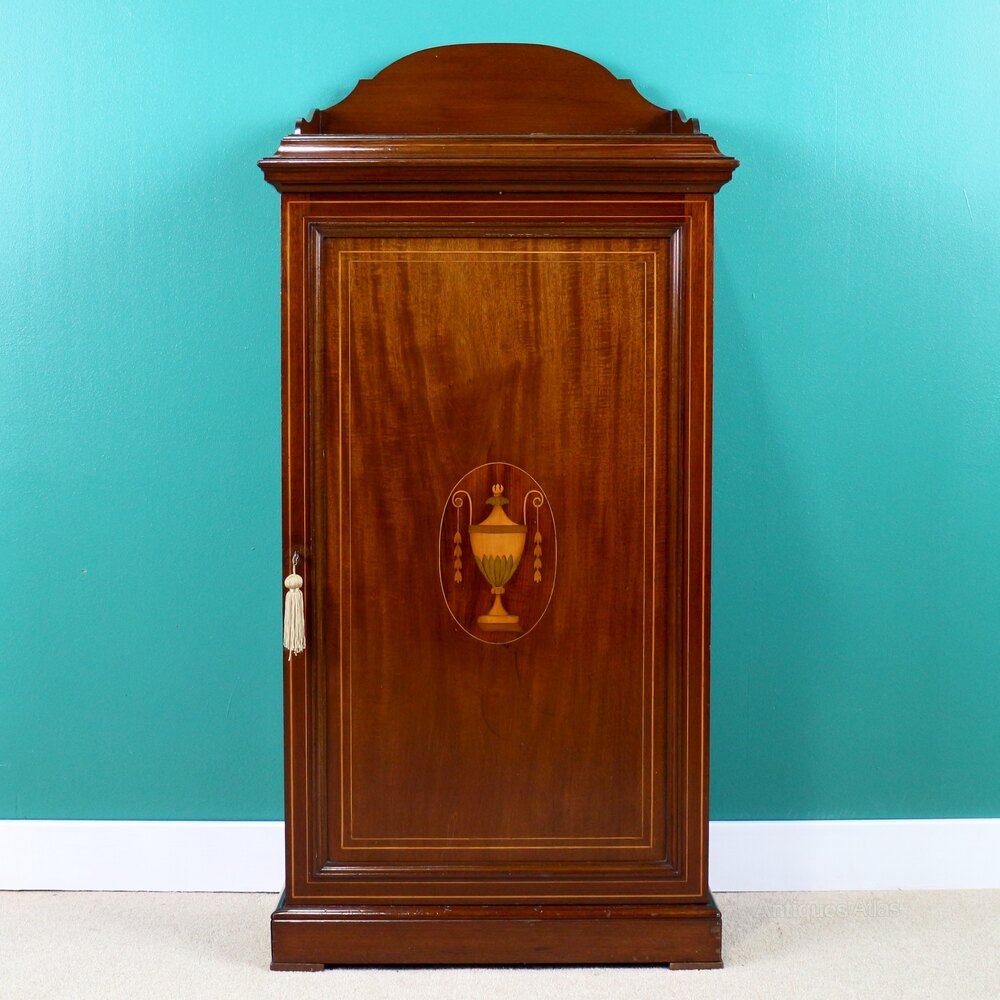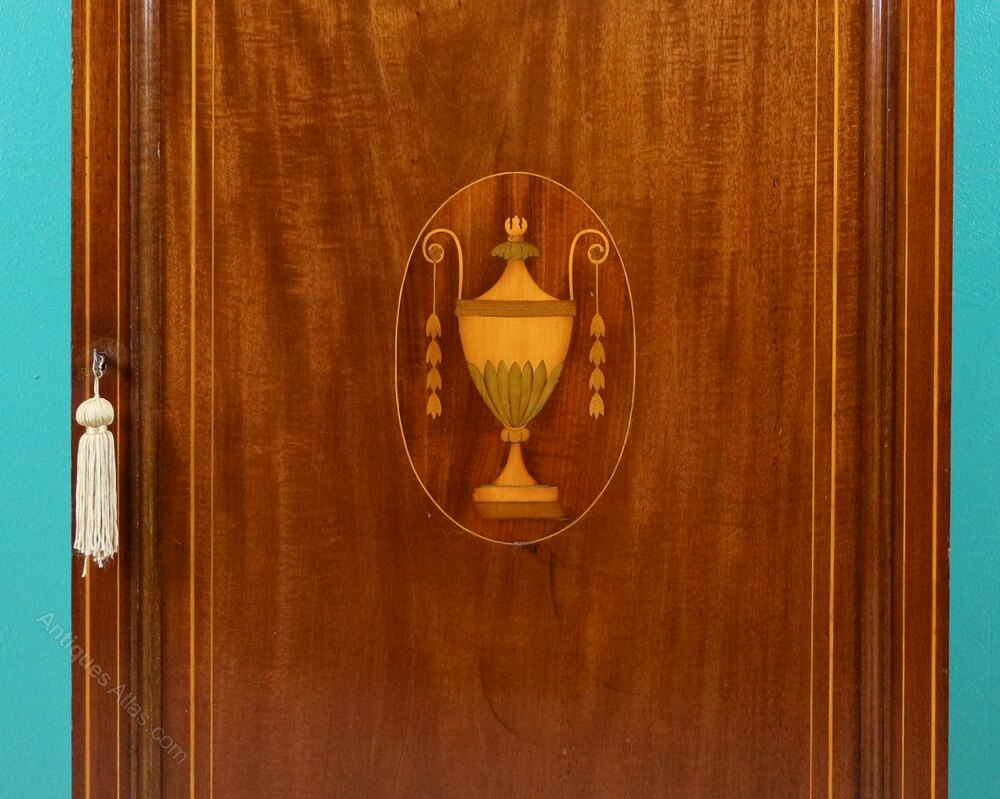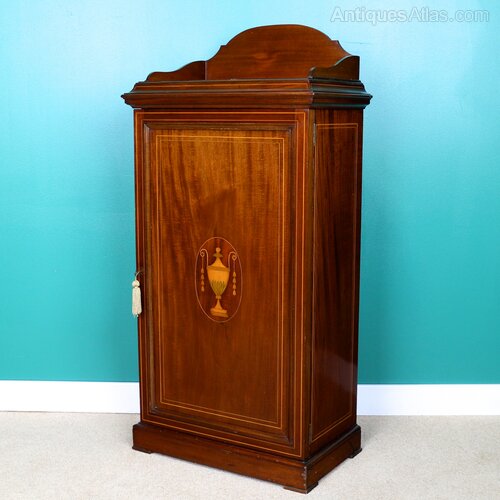 A super quality Adams style late Victorian mahogany and inlaid music or side cabinet by Francis Henry Keeble of London. The rectangular top with a high three-quarter gallery and slot for standing music, with boxwood stringing to the moulding below and further stringing to the front and sides, the fielded panel door centred by an inlaid urn motif and opening to reveal five adjustable shelves, all standing on a plinth base with low block feet.