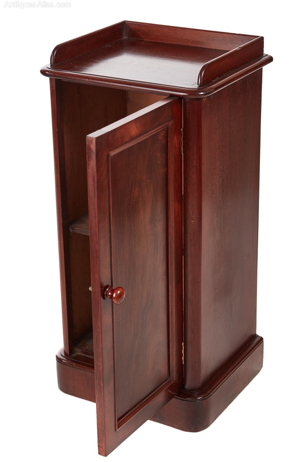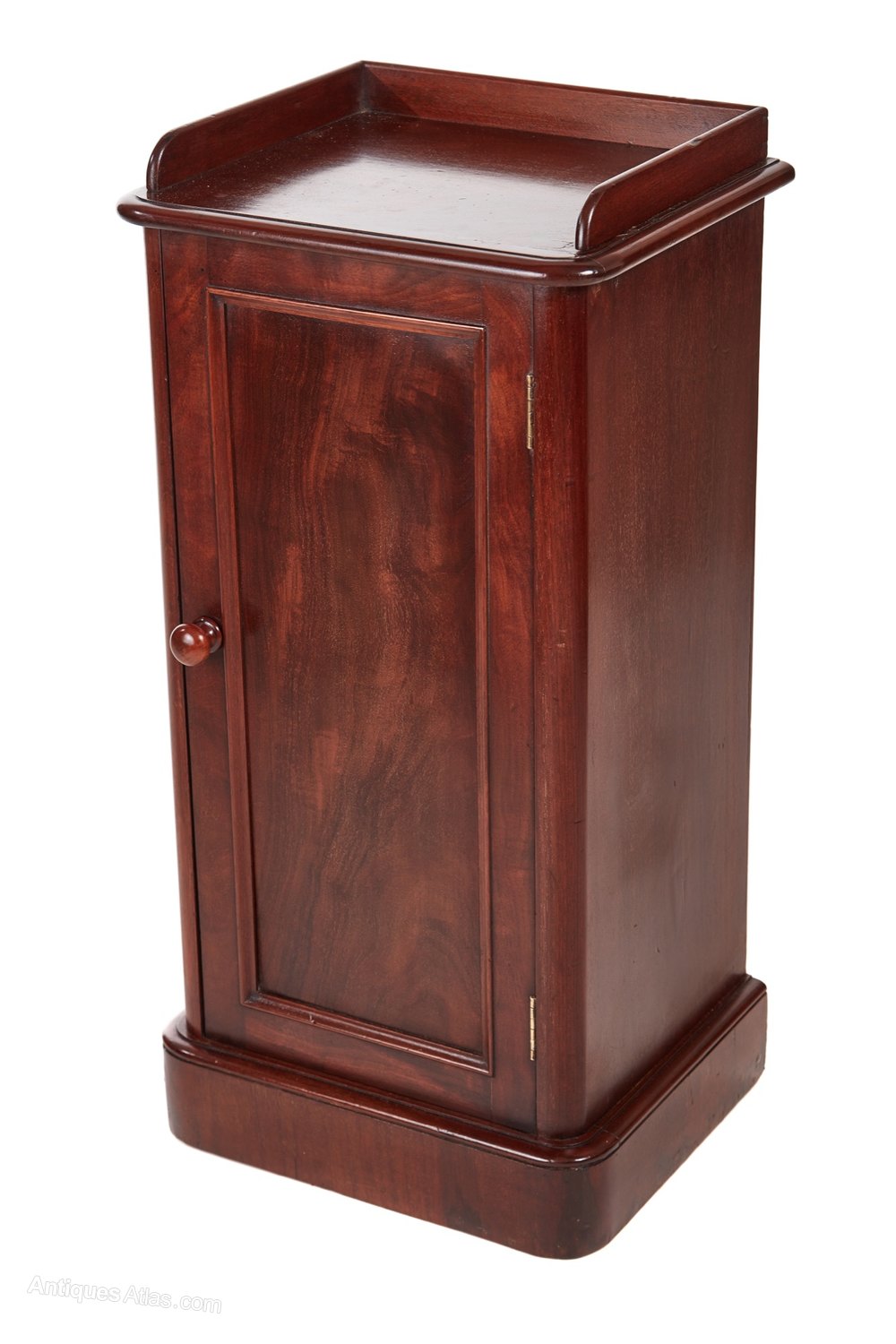 Victorian mahogany bedside cabinet,with gallery top thumbnail moulded edge and rounded corners,above a moulded panelled door with original turned knob handle,one inner shelf interior,standing on a plinth base