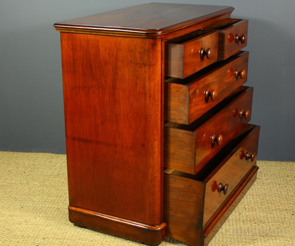 This Superb Victorian Mahogany Chest of Drawers is in Great Condition, having a rounded Corner, Ogee Edged Top sat above Two Small Drawers and Three Large Graduated Drawers, all of Dovetailed Construction, Fitted with Brass Escutcheon's and Lovely Original Wooden Turned Knob Handles. The Chest has a Plinth Base sat Upon Four Flat wooden Feet, the Front Dummy Plinth being part of the Bottom Drawer thus Maximising Storage Space when Opened. All the Drawers run Smooth and are very clean with solid bases, all in all a truly lovely Chest with Fantastic Patina and Colour making it an Ideal Practical Focal Point for any room in the Home.