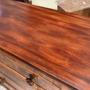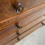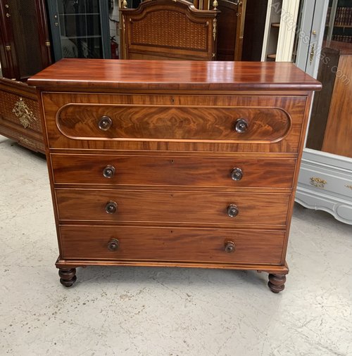 The chest has lovely figured veneers, original turned knobs and stands on turned feet.