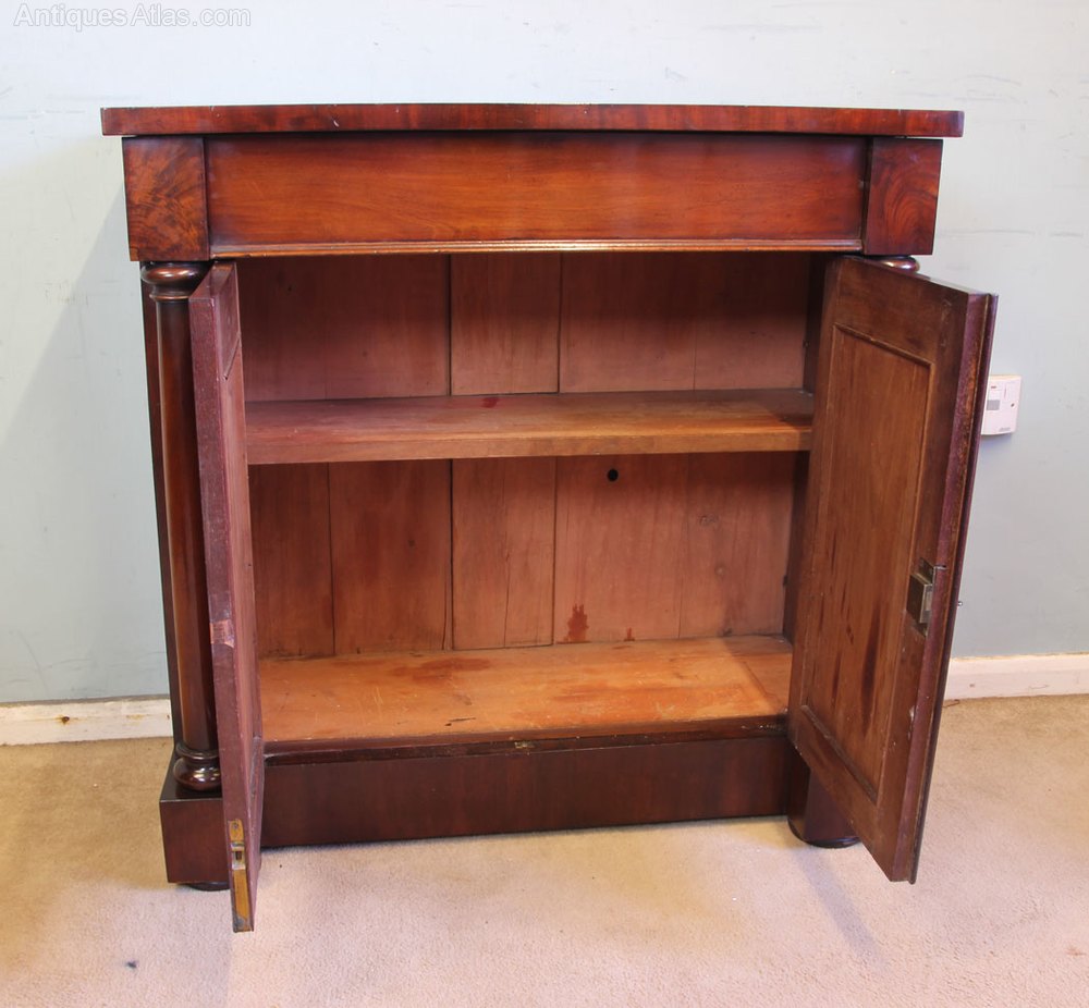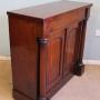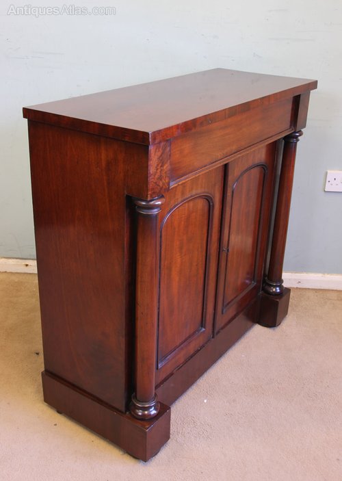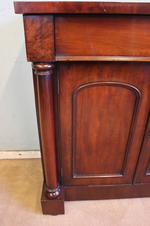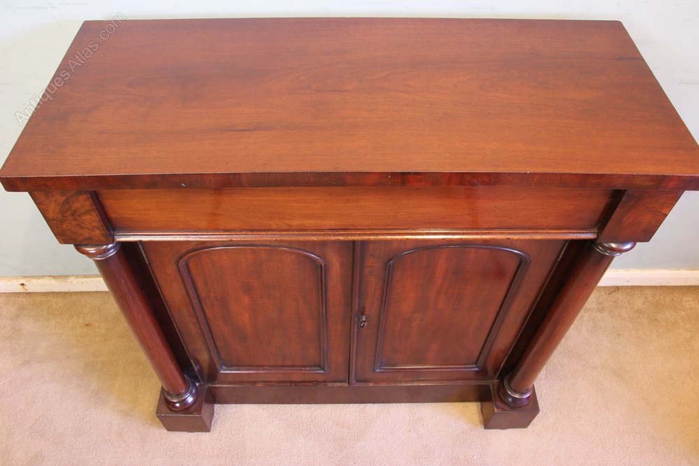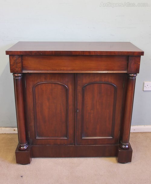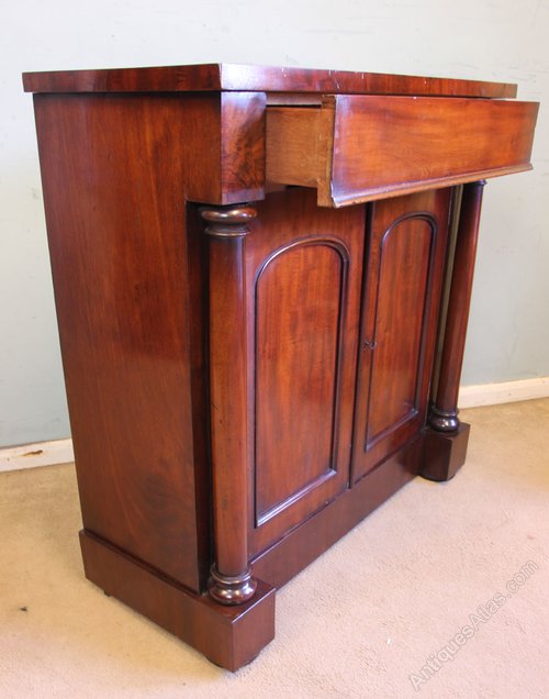 Antique Victorian Mahogany Chiffonier Sideboard Base. This Victorian mahogany chiffonier / sideboard base has a lovely mahogany top with single drawer under having two cupboards with arch panel and turned pillar either side the doors open to reveal storage space and one shelf. All standing on shaped base.