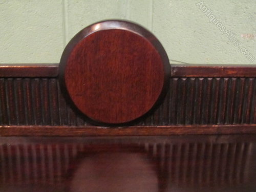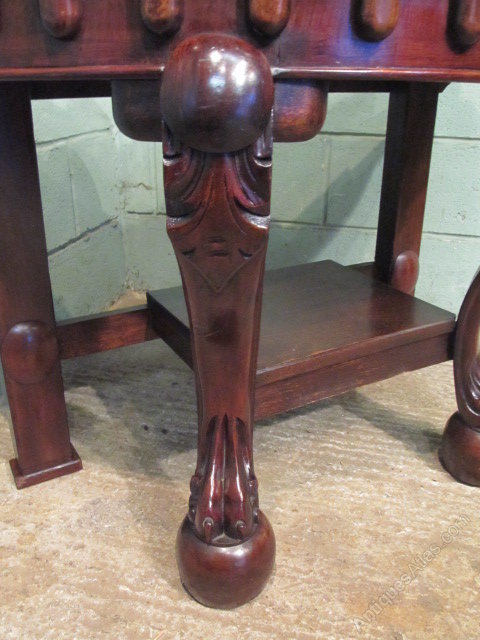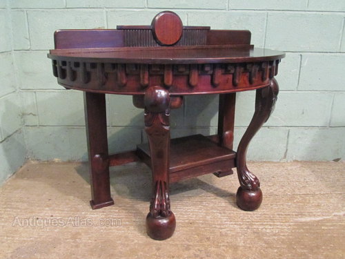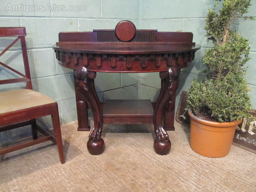 Antique Victorian Mahogany Demi Lune Table and dating from around 1880. Constructed from quality mahogany it has a raised back with a moulded round panel to the centre. It has a square edge to the top with a deep moulded frieze below and stands on curved and carved legs on a large ball foot joined by a central shelf.