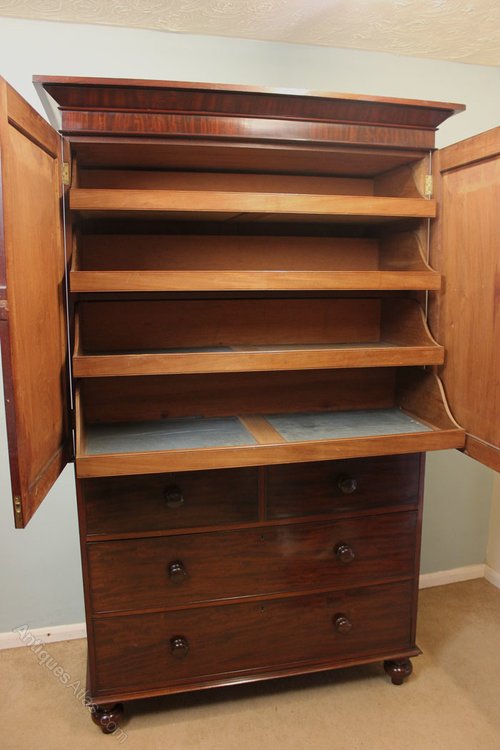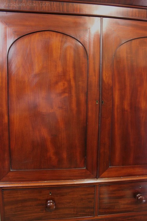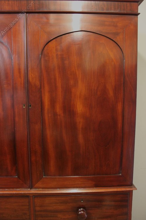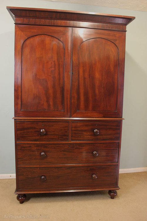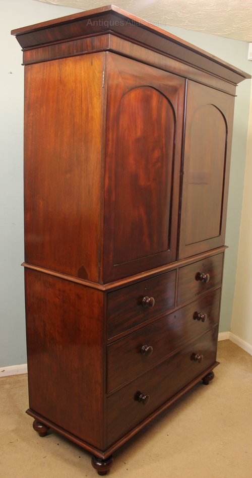 Antique Victorian 19th century figured mahogany linen press, It has a moulded cornice above two cupboard arched panelled doors, The interior has four mahogany sliding trays, The lower section having two short drawers over two long drawers having turned wooden handles and stands on turned feet, Circa 1880