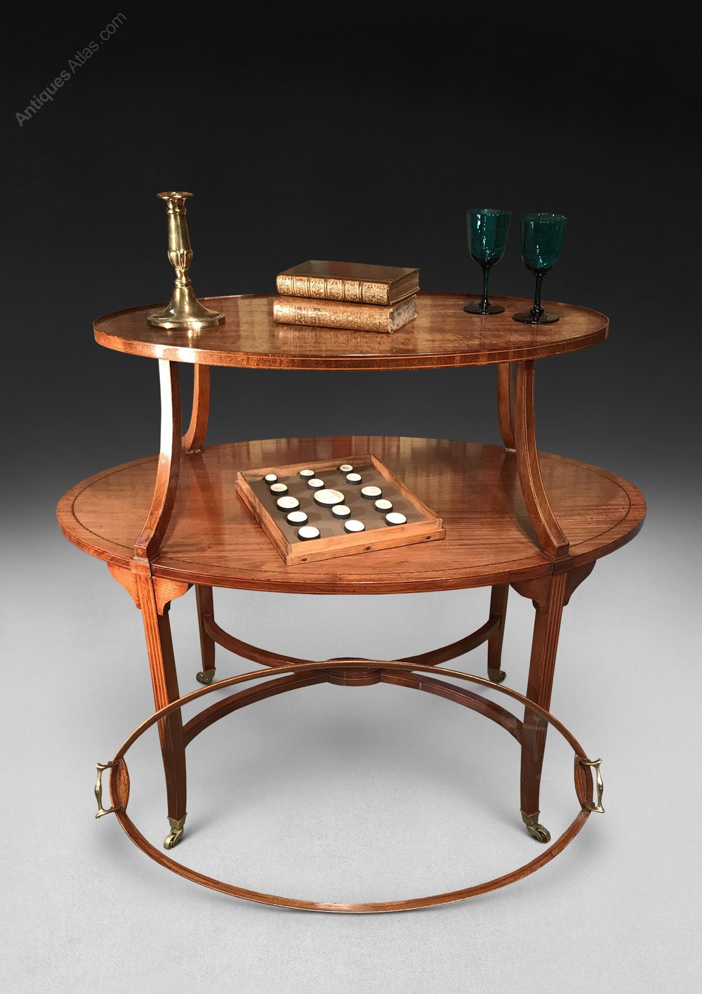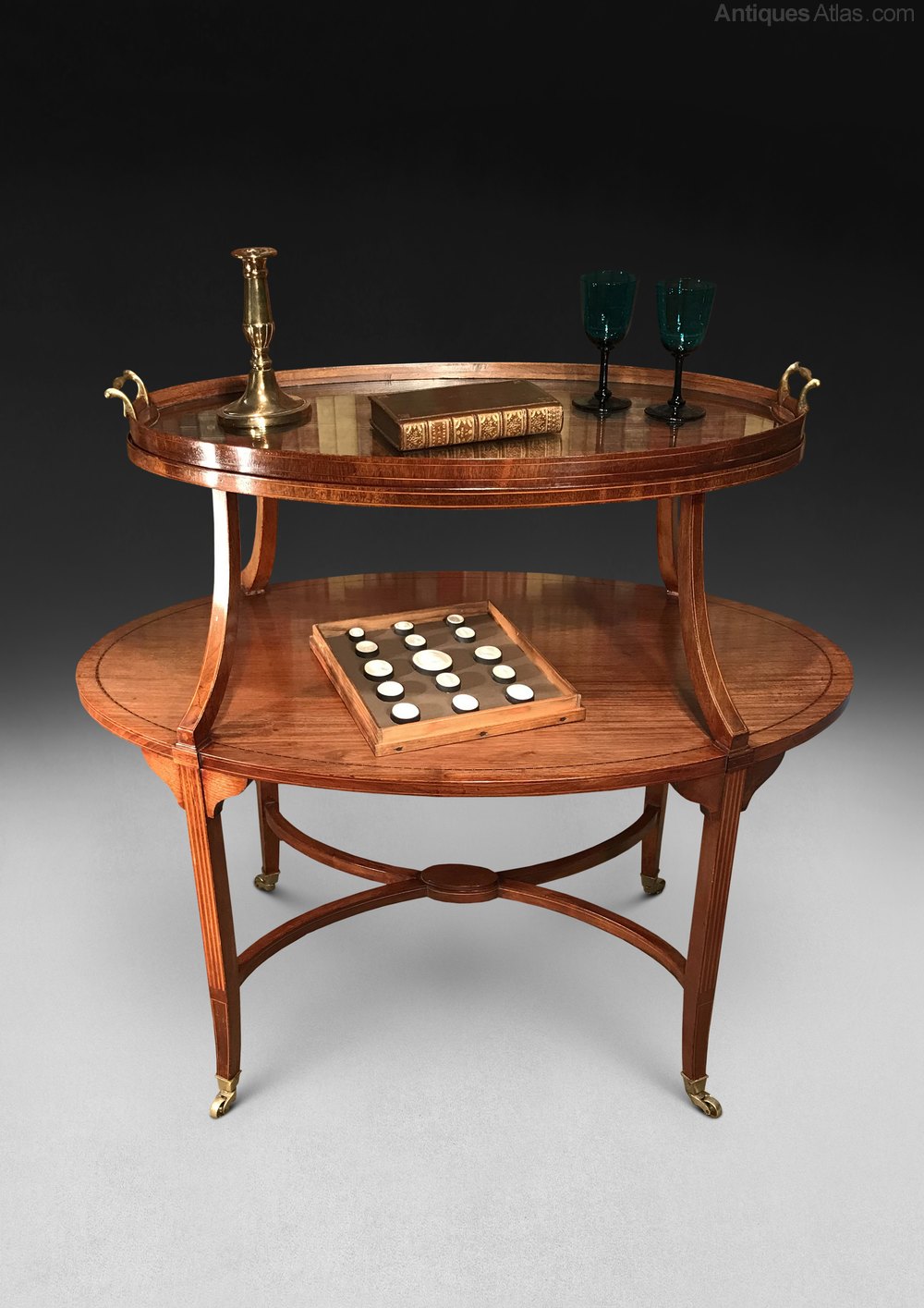 A late Victorian Mahogany oval tray table, the glass bottomed tray with brass handles above a two tier stand with chequer banding and line inlay, the square tapered legs united by a stretcher and terminating in brass cups and casters.