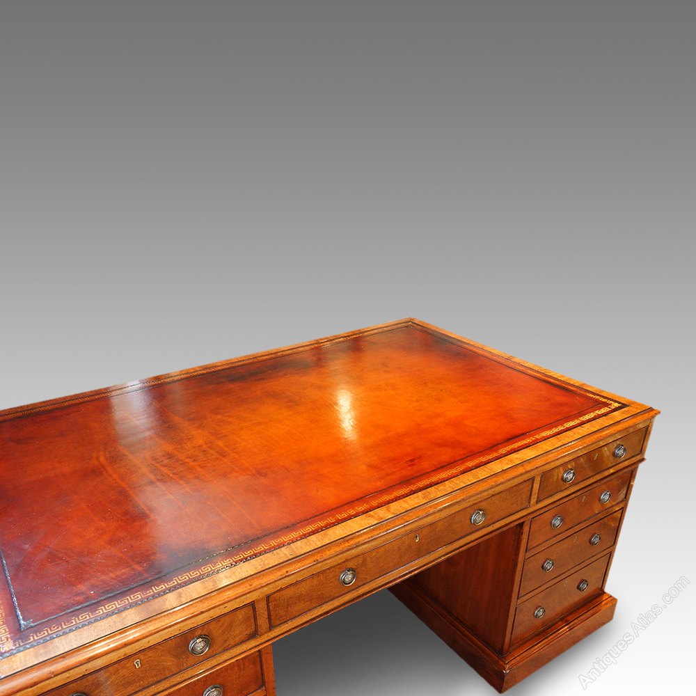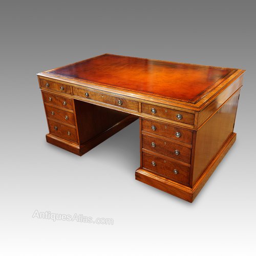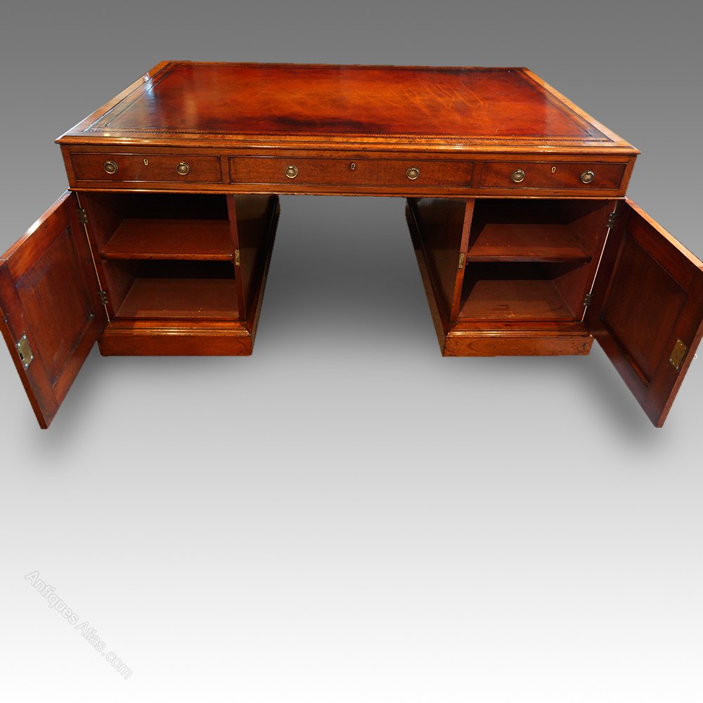 This antique desk has the normal 9 drawers to the front and 3 drawers and a pair of cupboards to the rear.