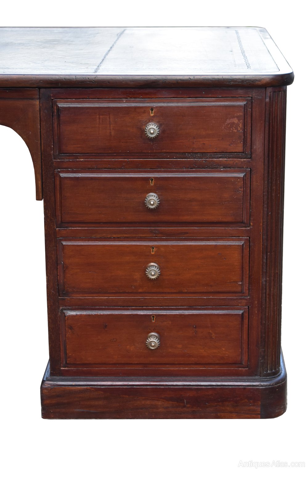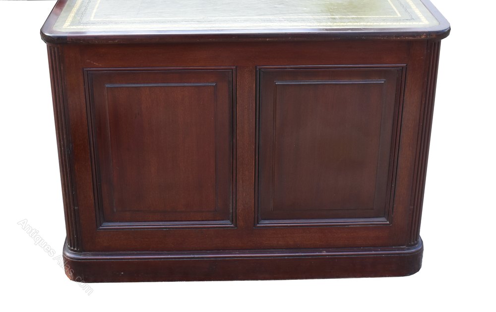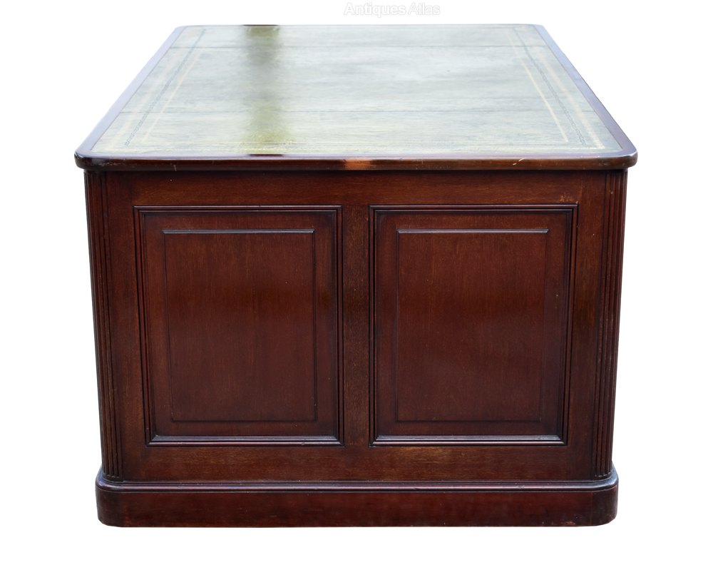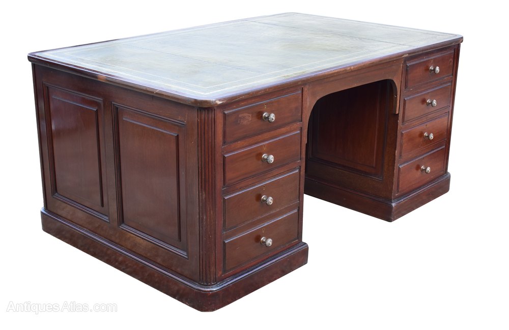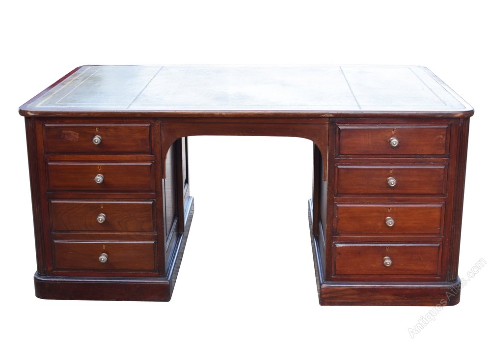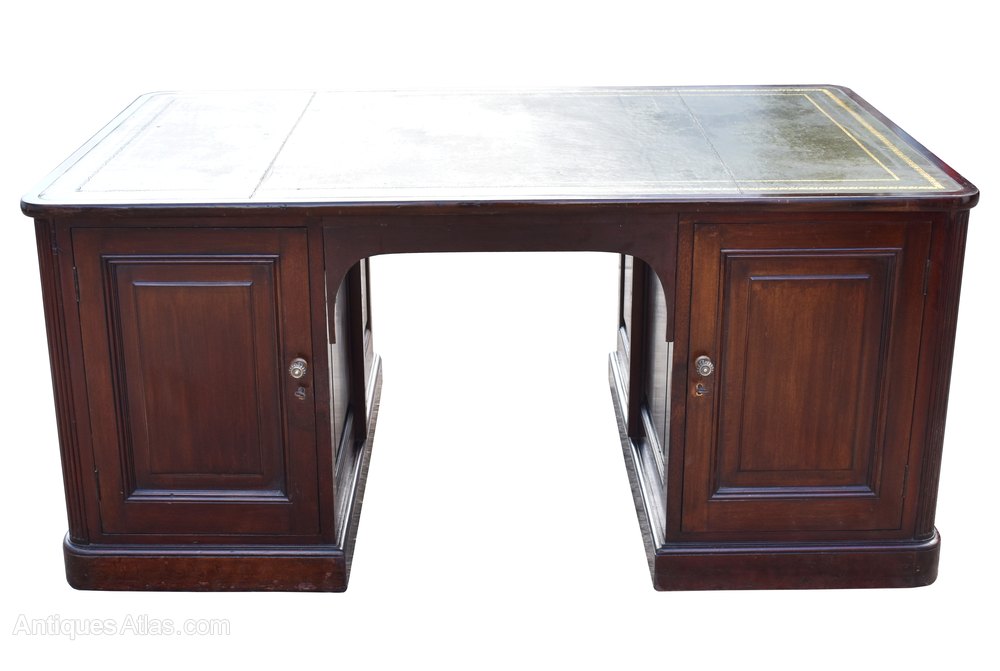 For sale is a good quality Victorian mahogany partners desk. Having a green leather skiver decorated with gold tooling, fitting onto two pedestals, the right with four graduated drawers, and the left having two graduated drawers above a large file drawer at the base, each with brass handles. On the opposing side the desk has two cupboards. The desk is complete with all of its original Hobbs & Co brass locks. Alfred Charles Hobbs was an American lock maker born in 1812 in Boston, Massachusetts. He went to London representing a New York company called Day & Newell. Notably he was the first to pick a Bramah lock at the great exhibition of 1851. This piece is in good condition for its age, showing minor wear and marks commensurate with age and use.
