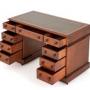 The Desk Features and arrangement of 9 Mahogany Lined Drawers with Turned Knobs.
