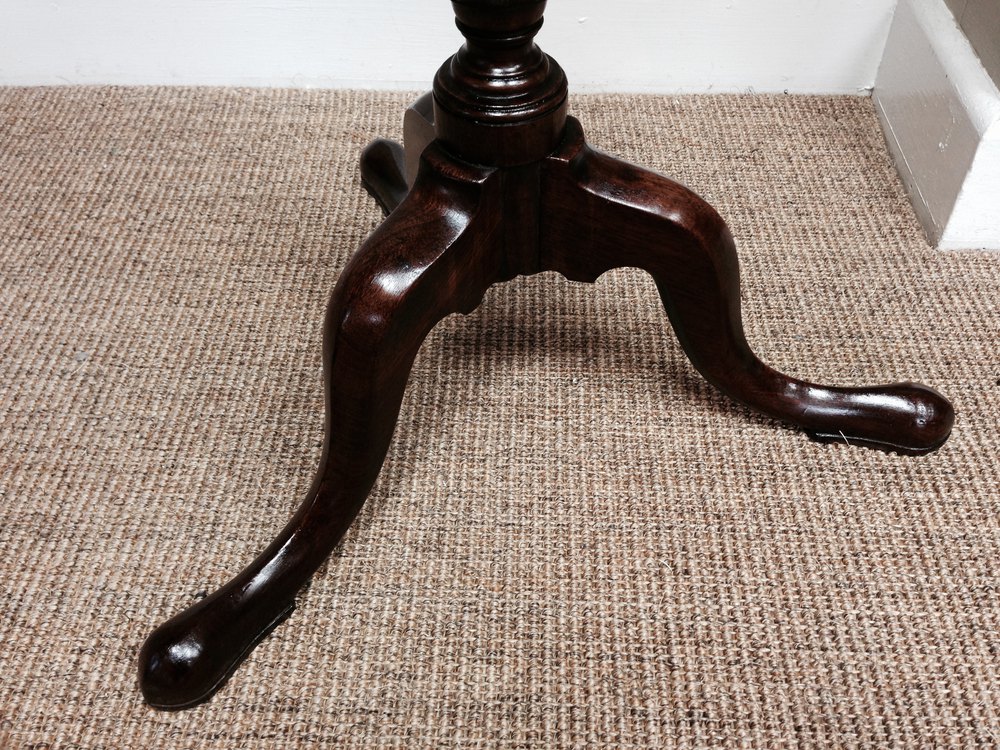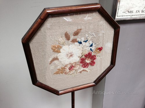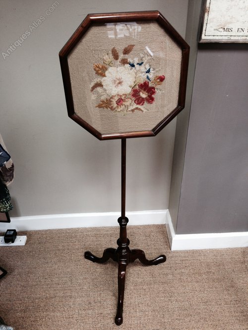 Hexagonal glazed embroidery frame, turned pole and tripod cabriola legs.