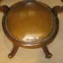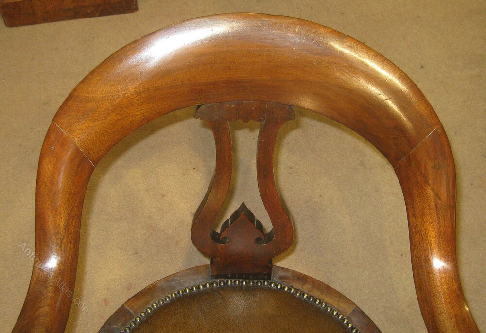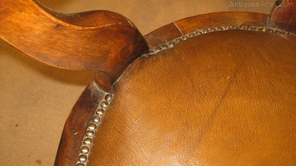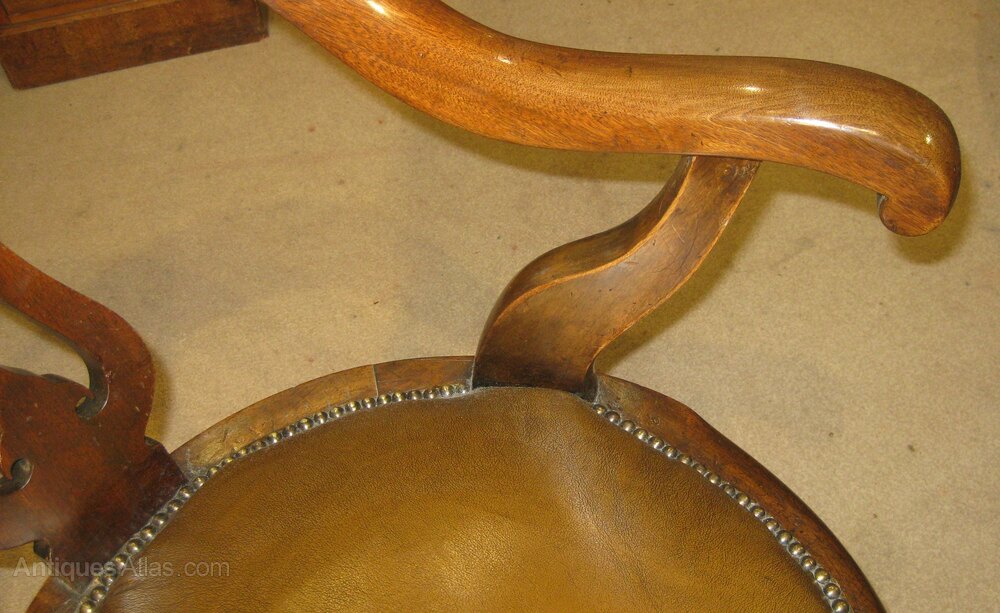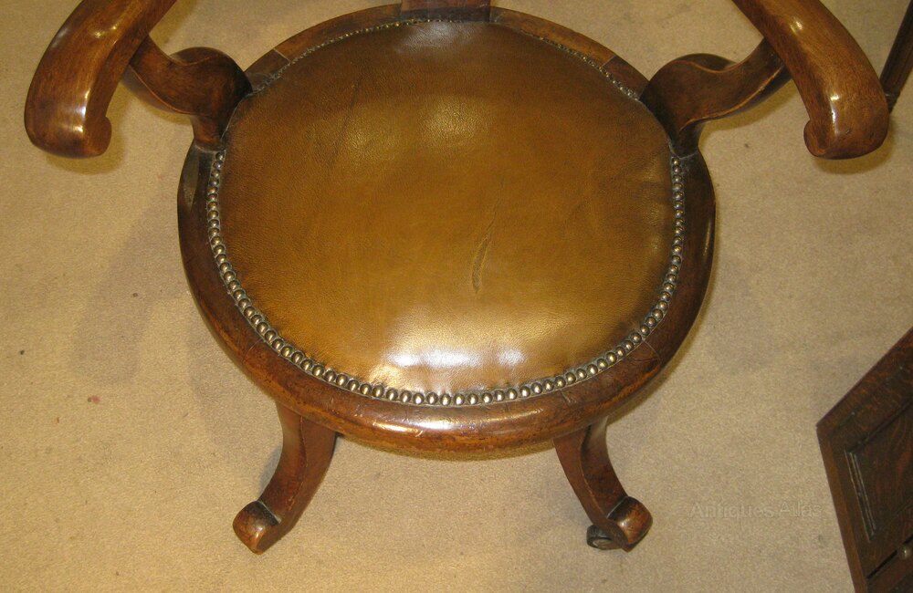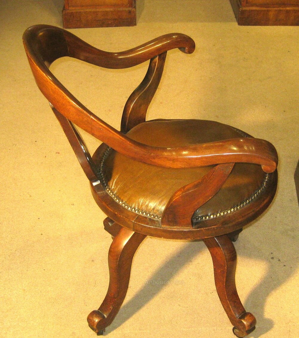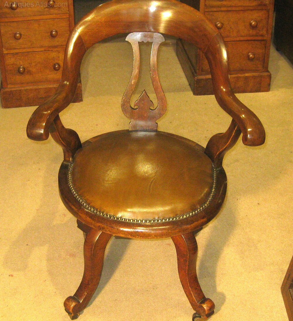 Victorian mahogany revolving desk chair. The well shaped back with decorative back splat and well shaped arms above a recently upholstered tan leather seat. On a free revolving base and nicely shaped legs terminating in brass castors.