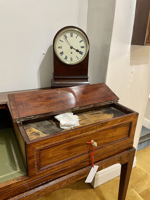 Mahogany and chequer line inlaid spinet case which has been adapted for use as a writing desk. Recently restored and replacement skiver.