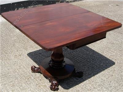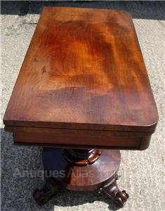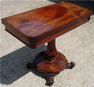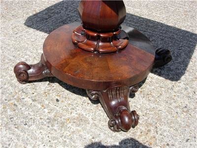 Early Victorian Mahogany Tea Table in good original condition,slight fading in areas to the top, standing on fluted stem with carved feet.On one of the feet there is a piece missing which is shown and by the hinge but is not detrimental to the piece.