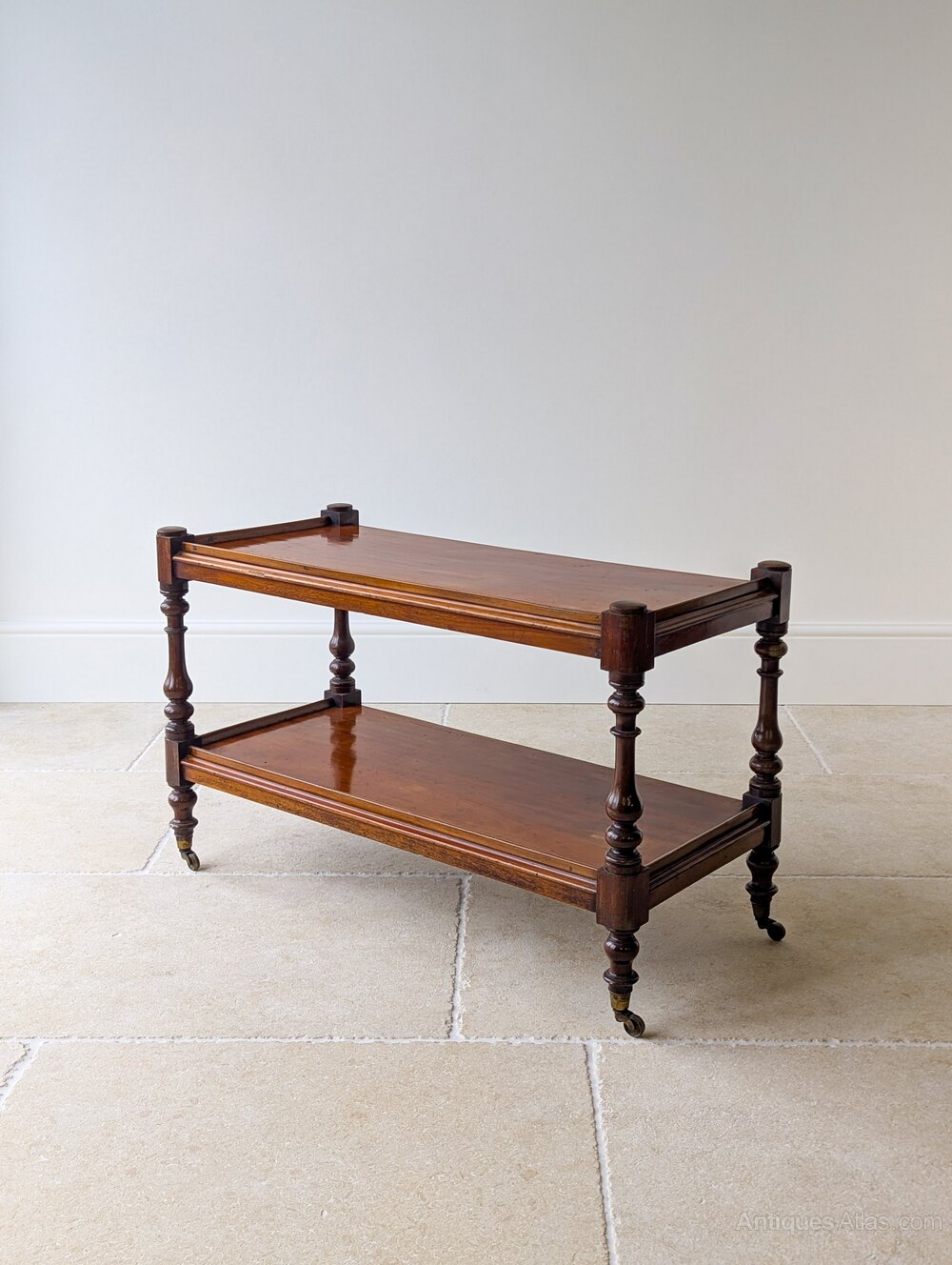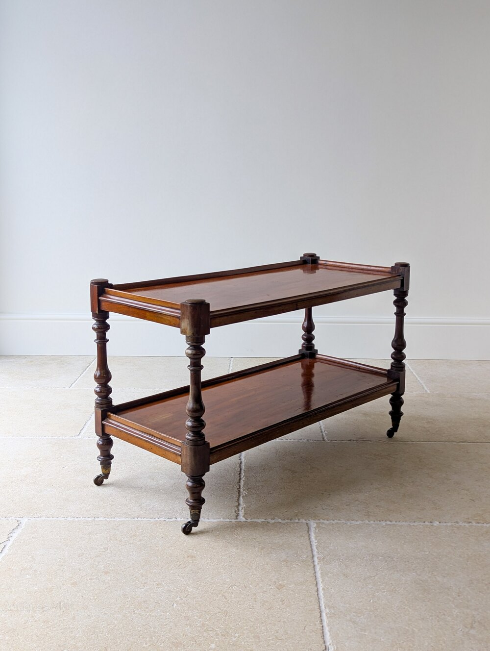 A refined piece of late Victorian service antique furniture, designed to move easily between rooms. Its narrow footprint and twin shelves make it equally practical today as a side table, drinks stand or display stand for ceramics, books, or objets d’art.
