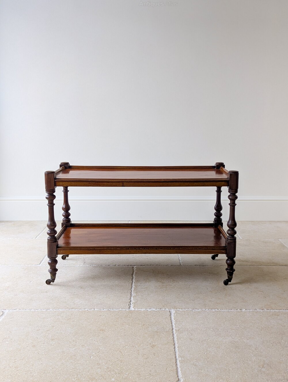 A late Victorian two-tier serving stand in well-figured mahogany with a warm, deep colour and pleasing patina. Each tier is framed with a raised gallery to three sides, supported at the corners by finely turned baluster uprights terminating with smooth running original brass castors.