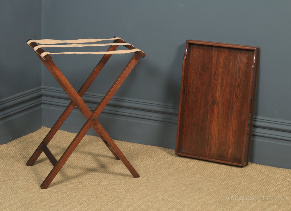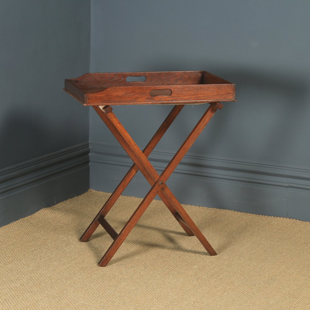 Condition This is a fine quality antique late Victorian butlers’ tray on stand, constructed of solid oak, with a lovely mellow colour, circa 1870, in excellent original condition. There are nominal old use marks to the leading edges and top but nothing significant considering the age of the item and years of use. The oak Butlers’ tray has been wax-polished by hand to a professional standard in our workshop. There are no ring / water marks on the tray top surface. The hinged oak bars to the stand are original and in good working condition. There are no splits to the top either. The wooden tray and stand are both sturdy. This oak butlers’ tray is solid in joint and ready to use.