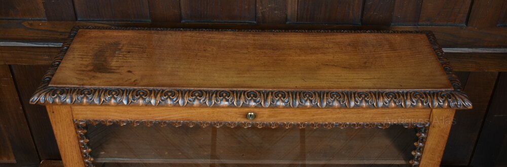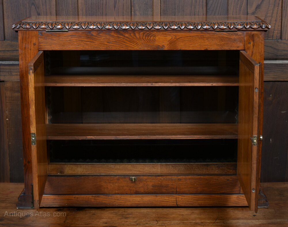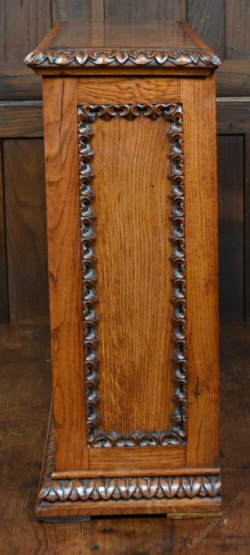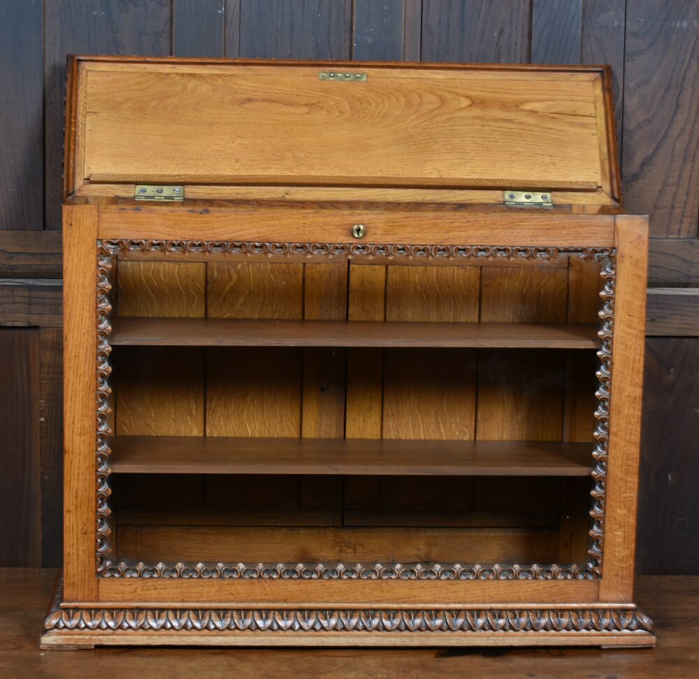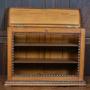 A characterful Victorian counter-top shop cabinet in solid oak, showcasing warm tones and richly carved detailing along the top, front and base. The hinged top opens to reveal a spacious compartment, while the rear access panel allows for practical use in a retail or display setting—ideal for shopkeepers, collectors, or interior designers seeking authentic period charm. The vertical plank back and shaped apron lend rustic appeal, while the craftsmanship speaks to late 19th-century utility with decorative flair. Whether used for display, storage, or as a conversation piece, this cabinet offers both visual interest and functional versatility.